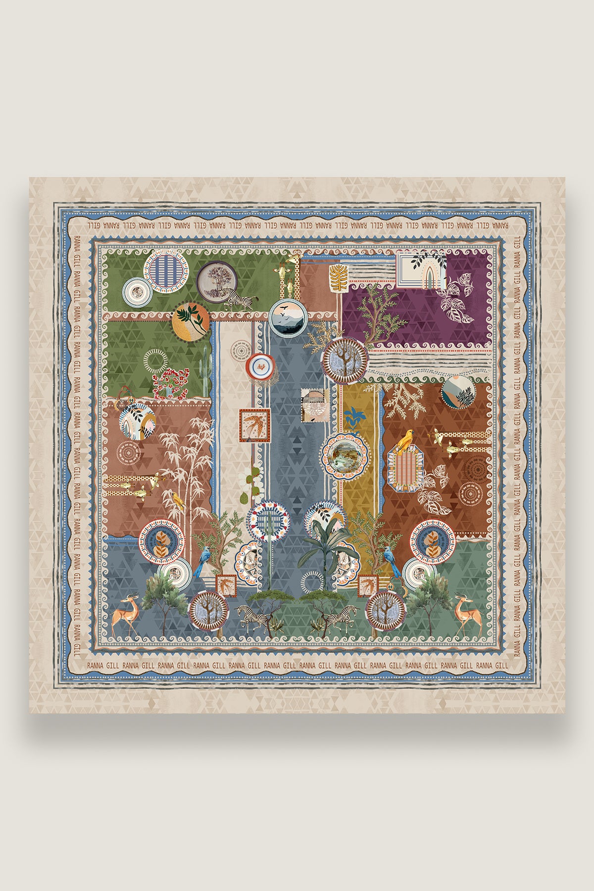 The Santa Fe Scarf captures the spirit of wanderlust through its rich patchwork of earthy tones and global-inspired motifs. Designed in Ranna Gill’s signature Santa Fe print, it is made from silk fabric.