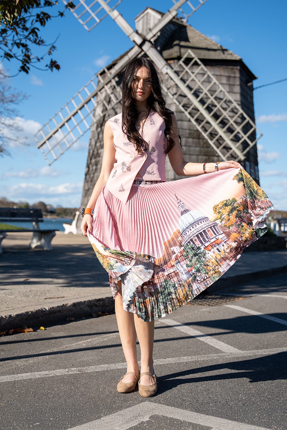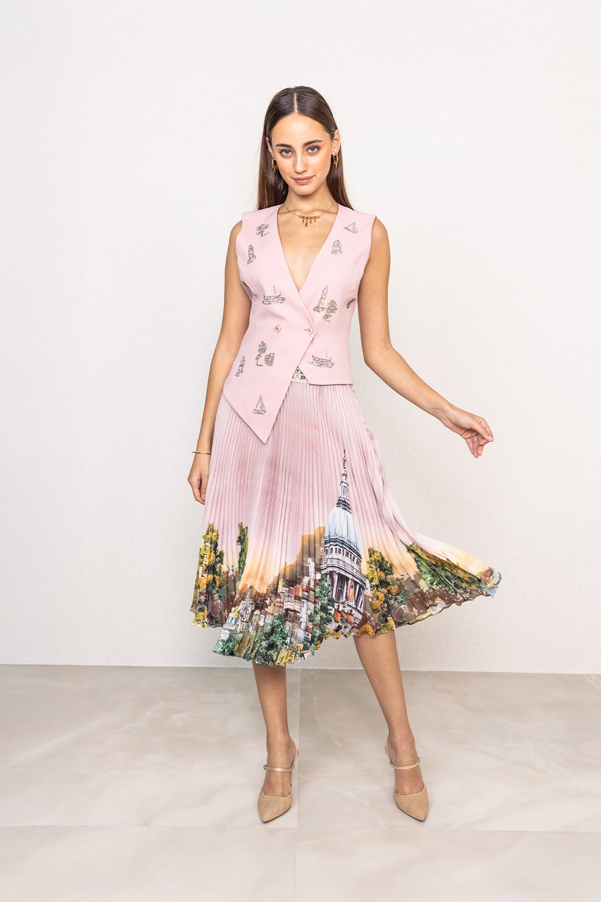 The Celara Asymmetric Skirt Sets, crafted in royal georgette, is a sleeveless piece shaped with a deep V-neckline and an angular front overlap. Finished in pink, it features subtle ROME artwork scattered across the fabric, inspired by city landmarks and fine line illustrations. The asymmetric hem adds a sharp edge, while the button detailing anchors the wrap-style construction. When worn, the waistcoat sits close to the body, offering a clean, structured fit with layered visual interest.