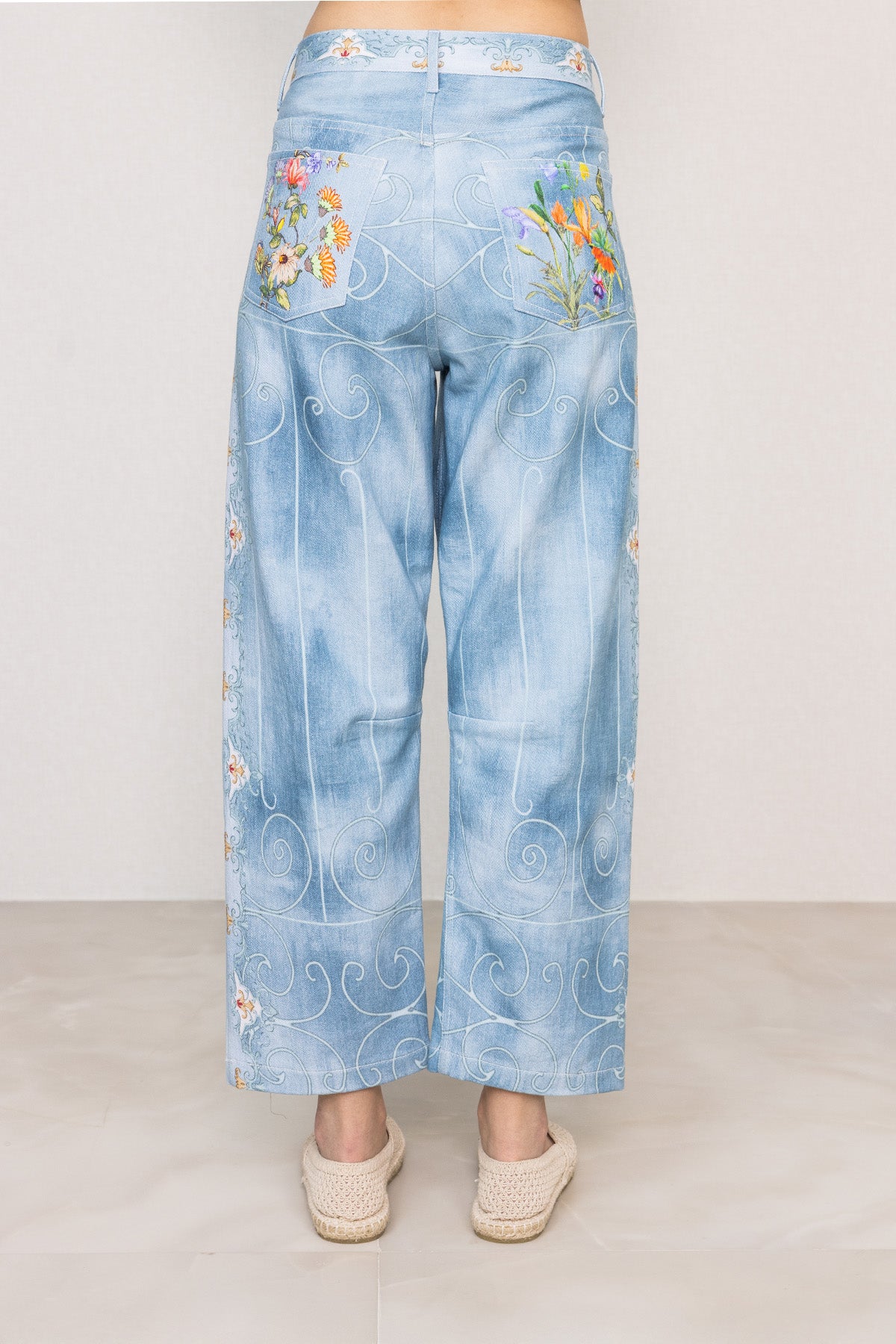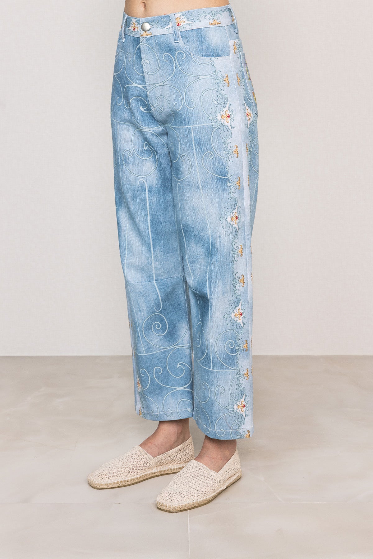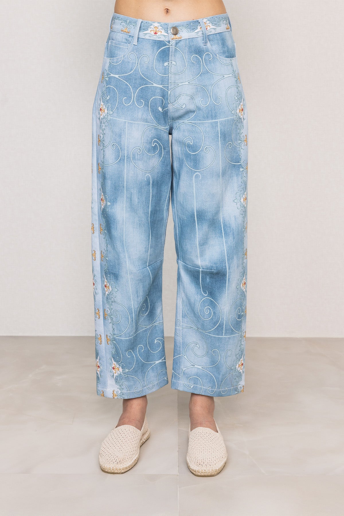 Featuring Ranna Gill's Palma Barrel Pant, that comes in a washed blue denim base with the Trellis print running softly across the surface. Shaped with a relaxed barrel leg and clean waistband, it sits easy through the hips and tapers subtly toward the hem for a modern line. Designed for long days of exploring, café stops, or slow travel moments when comfort matters but style still stays in focus.