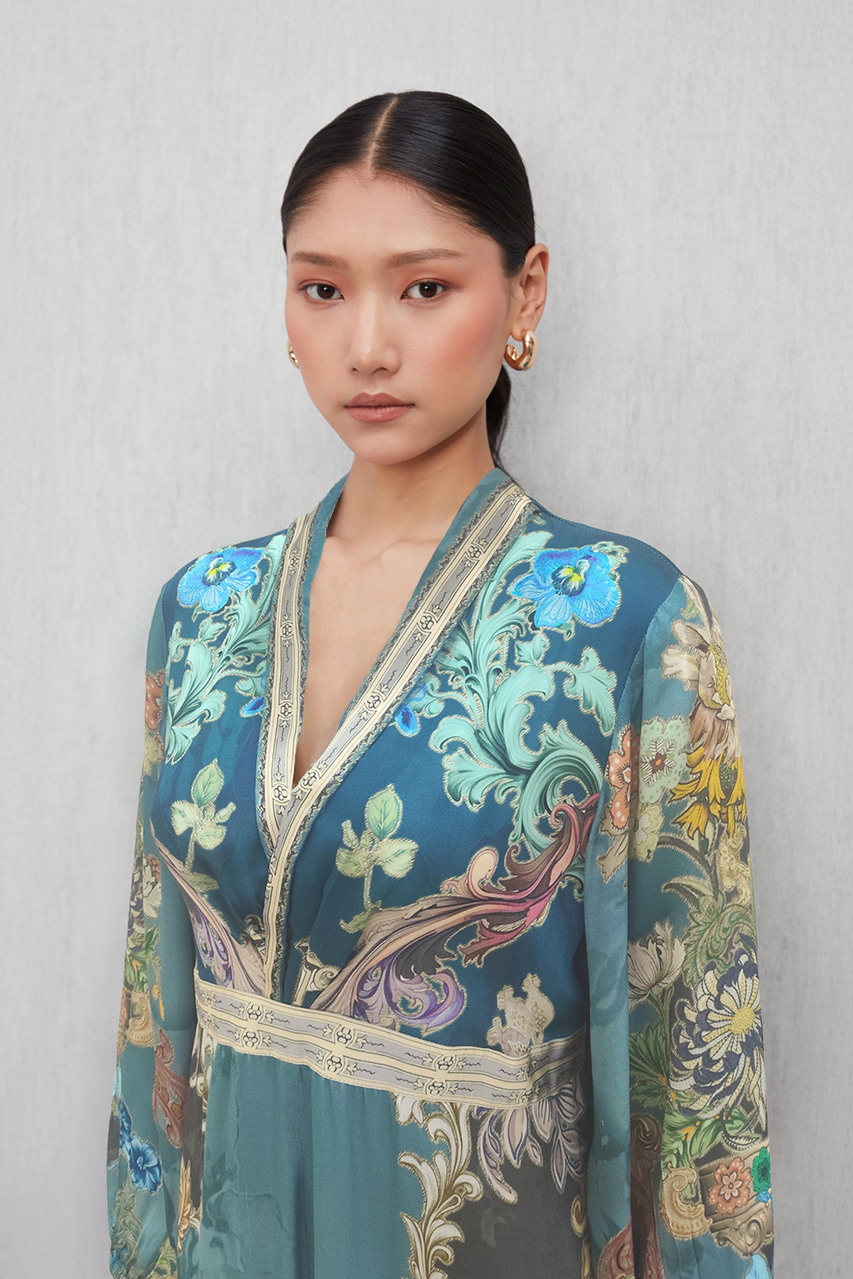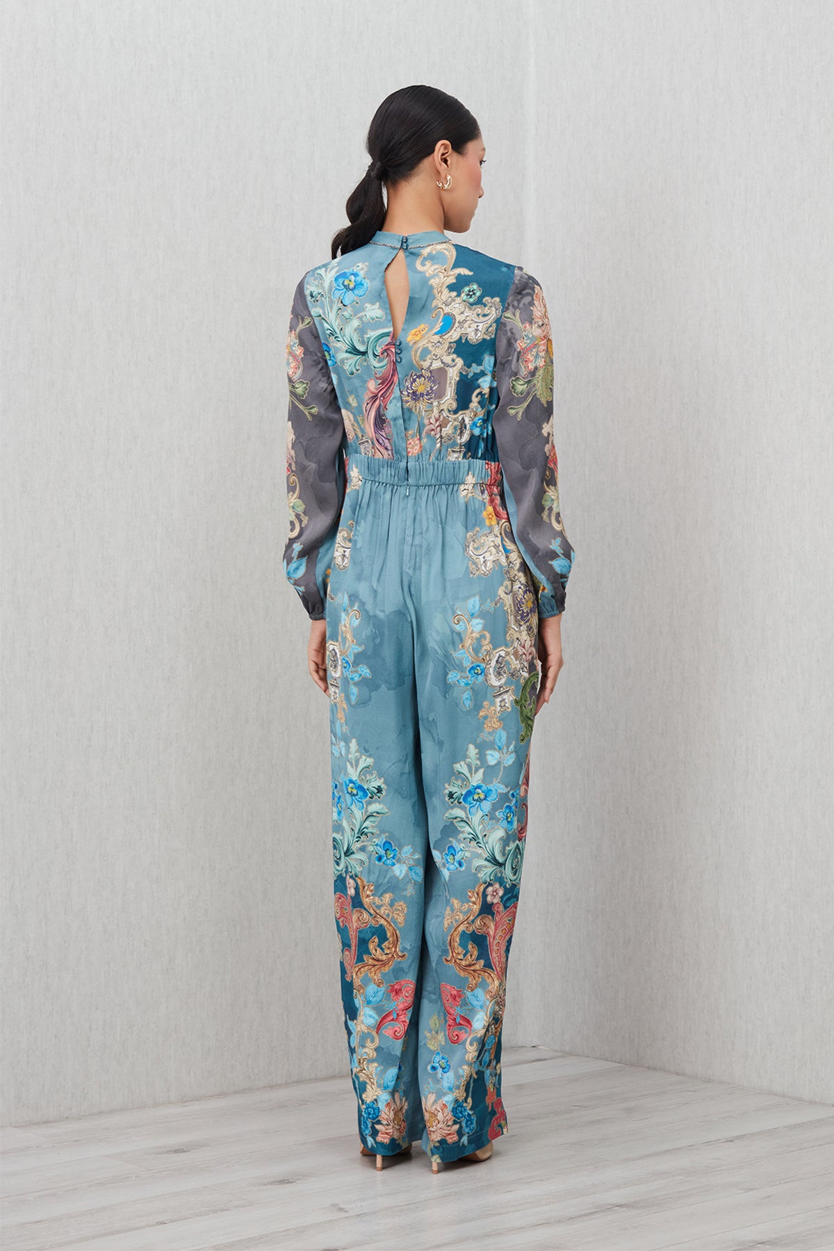 A vivid blend of drama and symmetry, Ranna Gill's Aurela Wrap Jumpsuit is a chic piece crafted in Modal Satin. Designed in a wrap silhouette, it features the Baroque print, ornamental swirls and floral motifs that cascade along the length of the garment in an array of rich hues. The fabric holds a soft sheen, while the waist is cinched with contrast borders that extend down into a fluid drape. The fit contours neatly through the torso and falls into a wide-leg shape, making it ideal for art previews, cultural evenings, or elevated dinner plans. A head-turner that feels like a one-piece story.
