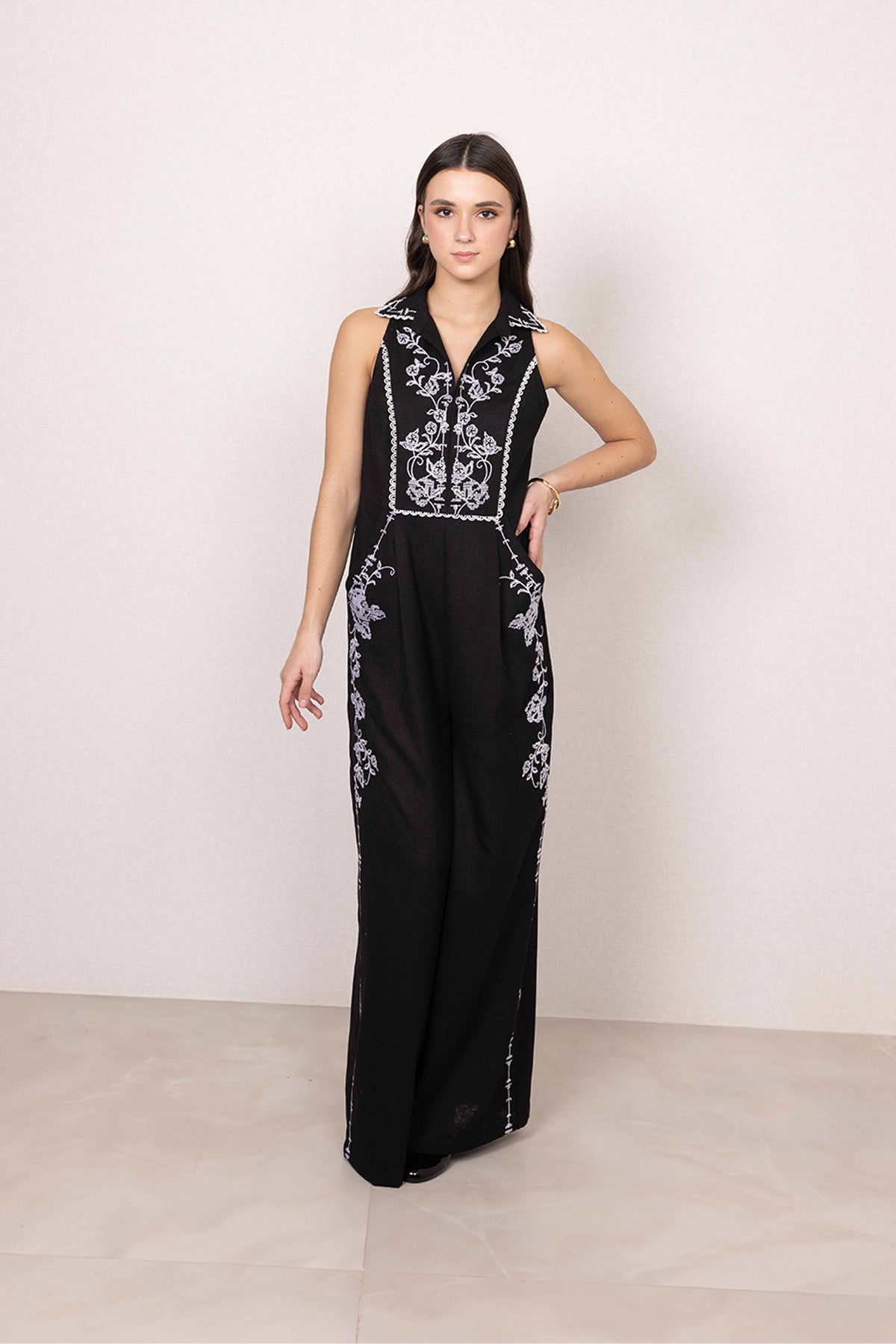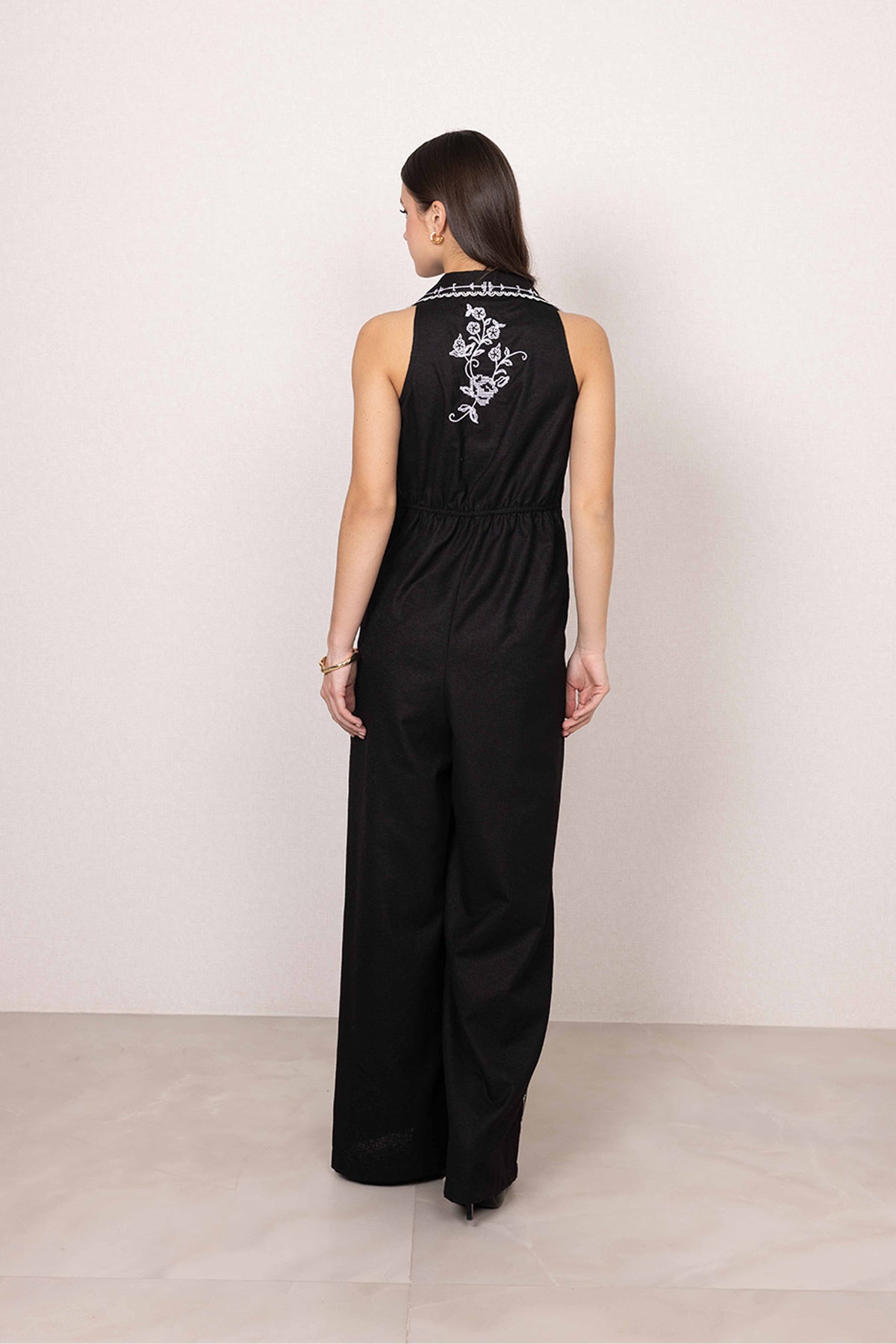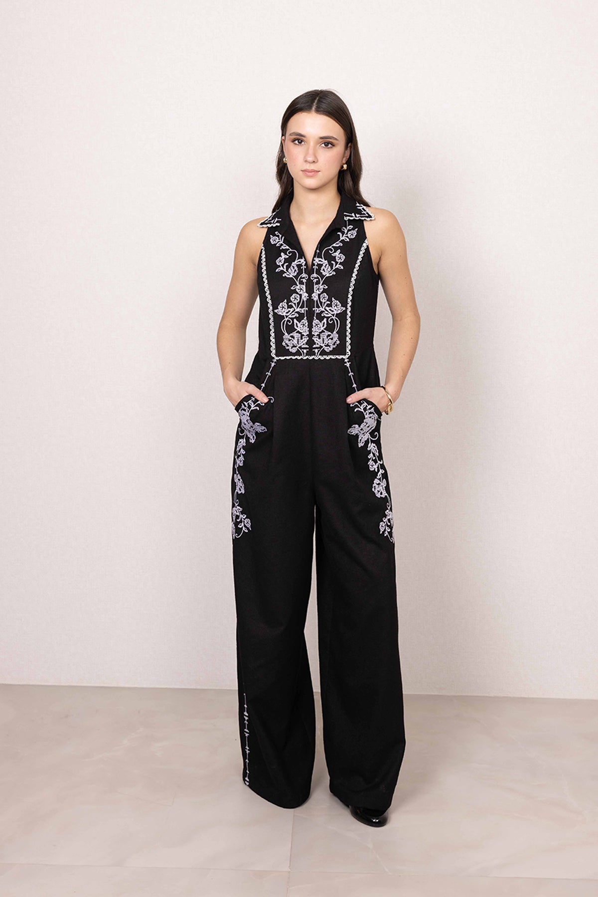 Introducing Ranna Gill's Reya Halter Jumpsuit in black, which is designed in breathable Poly Flex with a structured yet relaxed silhouette. The halter neckline frames the shoulders, while the bodice is shaped with a defined waist that flows into wide-leg pants.