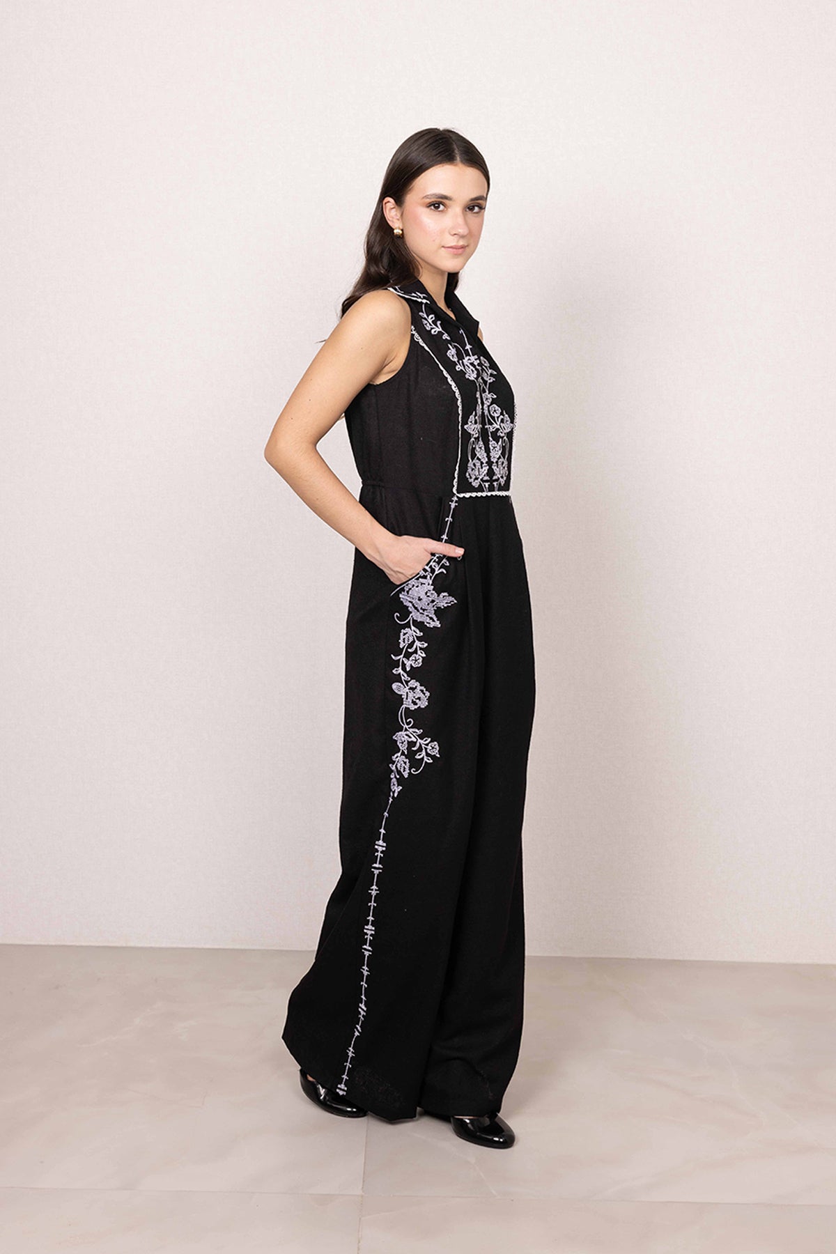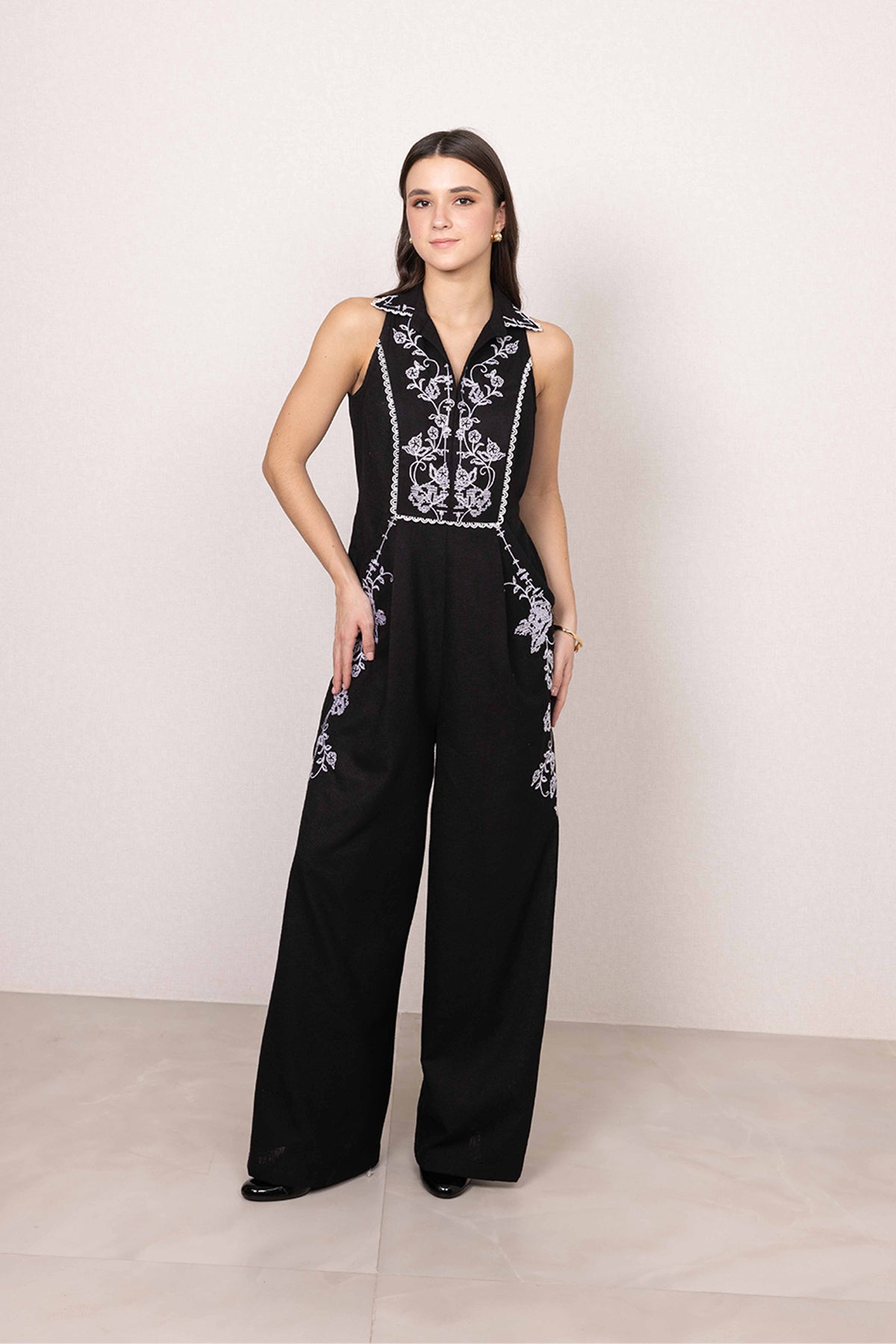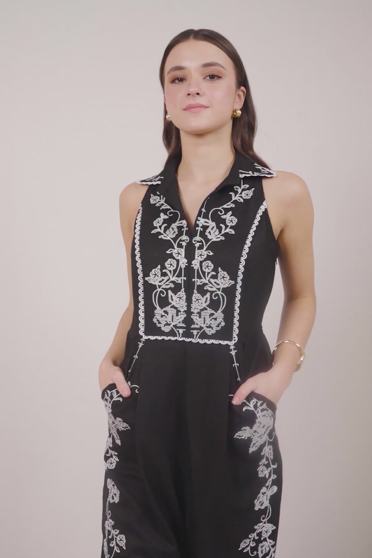 Introducing Ranna Gill's Reya Halter Jumpsuit in black, which is designed in breathable Poly Flex with a structured yet relaxed silhouette. The halter neckline frames the shoulders, while the bodice is shaped with a defined waist that flows into wide-leg pants.