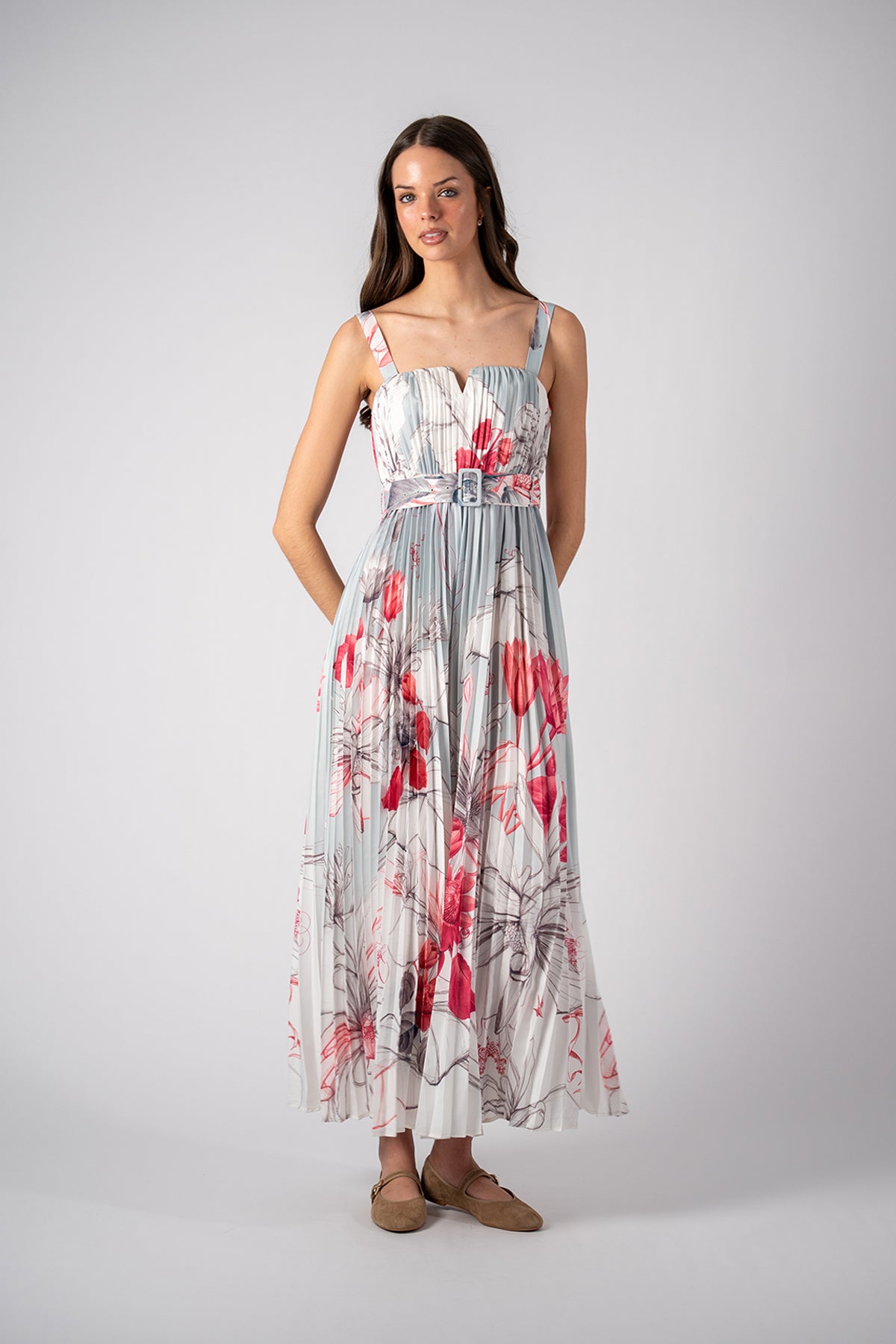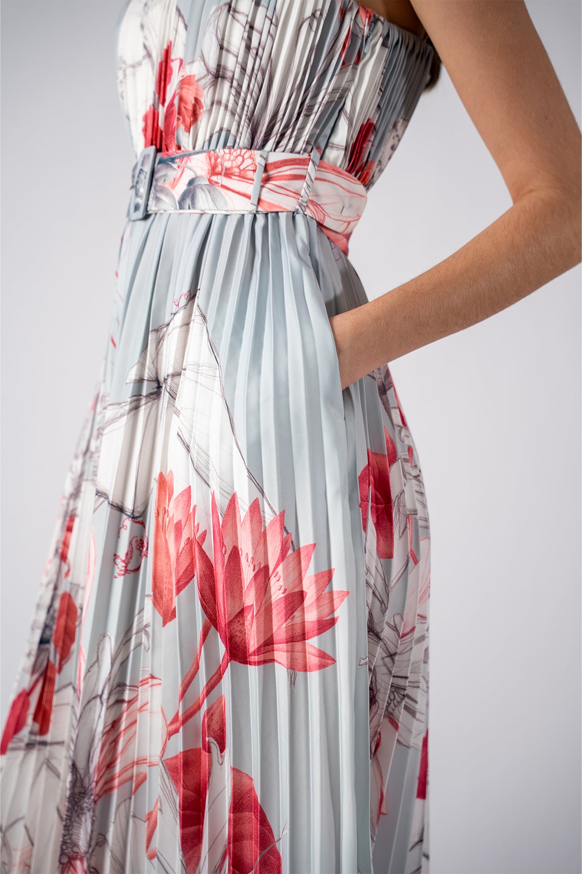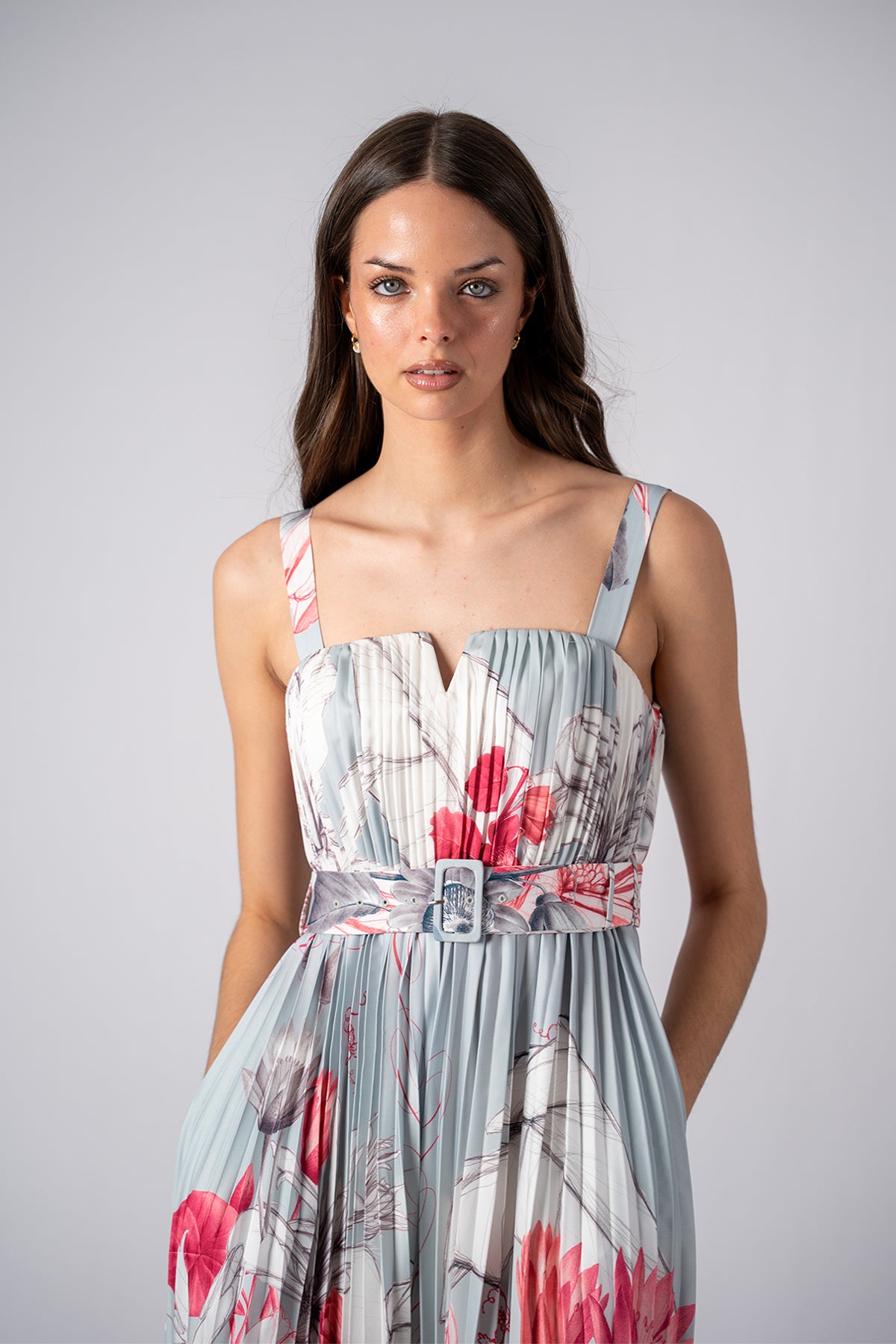 Introducing Ranna Gill's Snowbell Strap Pleated Jumpsuit in Camellia print, set against a soft powder blue base with floral accents in red and ivory. Made in fluid Poly Satin, it features a sweetheart neckline, wide printed straps, and fine all-over pleats that add a graceful fall to the silhouette. The matching belt with a fabric buckle defines the waist, while the full-length cut brings a clean, elongated look. A perfect pick for daytime occasions that call for something light yet elevated.