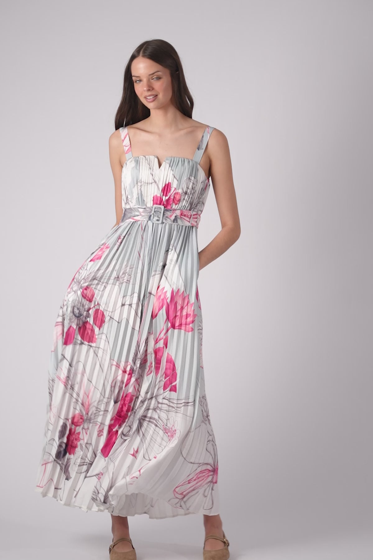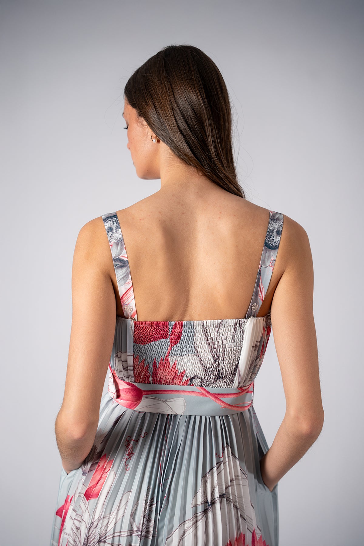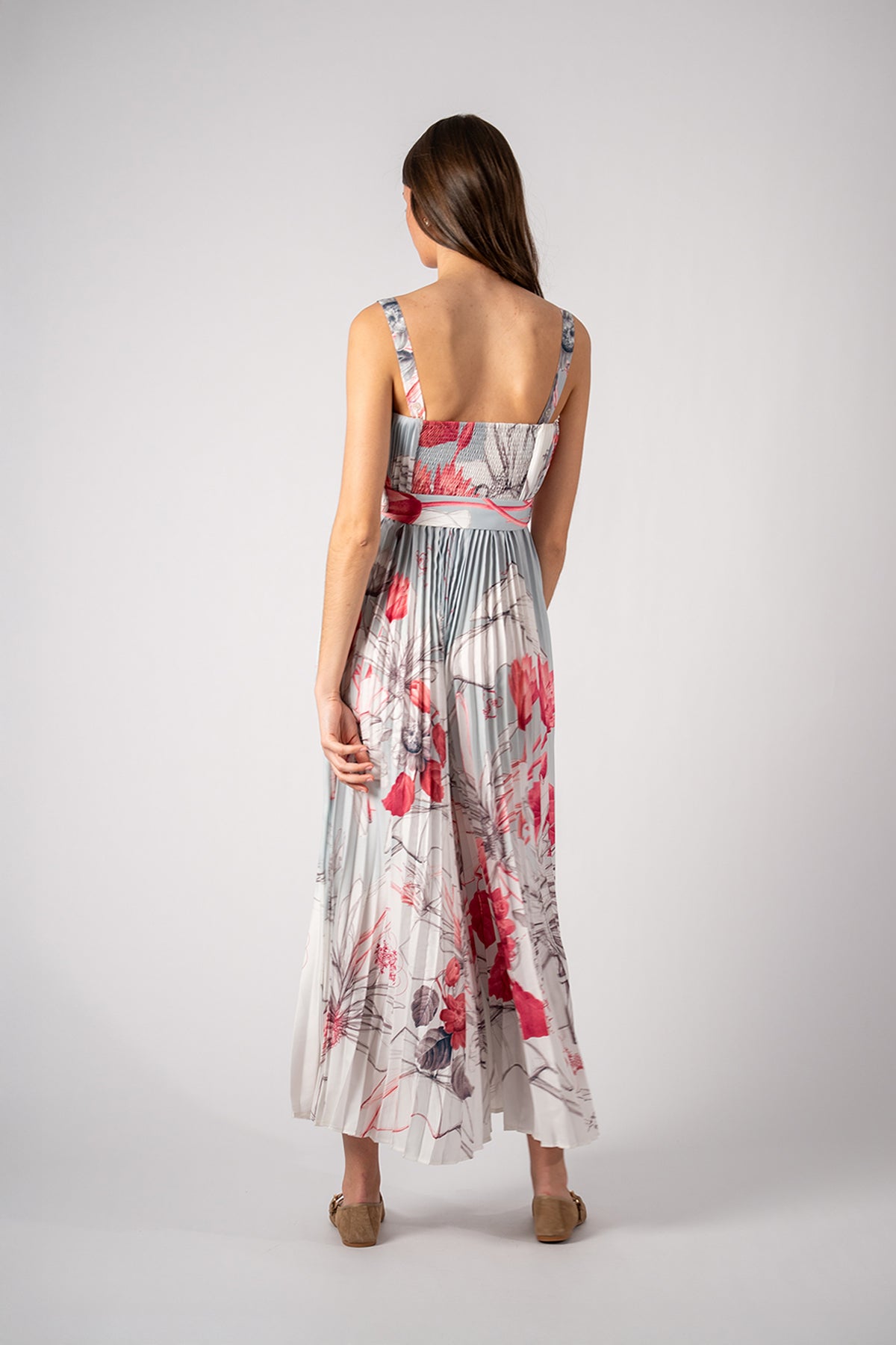 Introducing Ranna Gill's Snowbell Strap Pleated Jumpsuit in Camellia print, set against a soft powder blue base with floral accents in red and ivory. Made in fluid Poly Satin, it features a sweetheart neckline, wide printed straps, and fine all-over pleats that add a graceful fall to the silhouette. The matching belt with a fabric buckle defines the waist, while the full-length cut brings a clean, elongated look. A perfect pick for daytime occasions that call for something light yet elevated.
