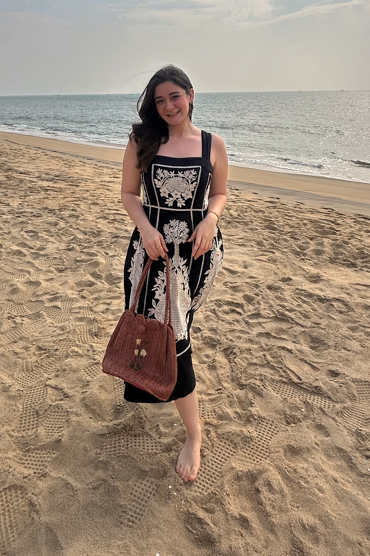 Woman wearing a black dress with white floral embroidery, standing against a plain background.