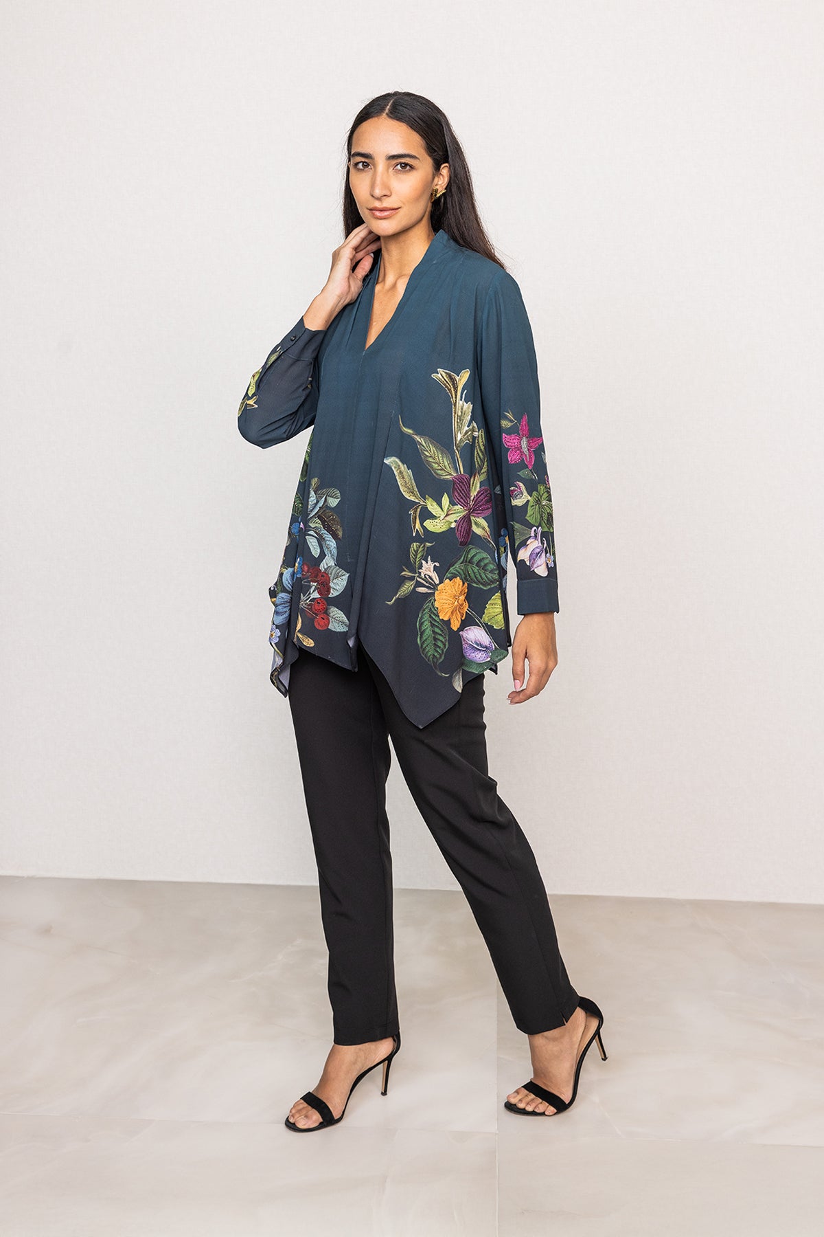 Ranna Gill's Bijou Blouse in teal hue is designed in fluid Royal Georgette with an asymmetric hem and soft pleat detailing through the front. The sleeves and lower panels feature striking botanical prints like layered florals, abstract leaves, and colors that lift the dark base. Perfect for gallery evenings, festive catch-ups, or that late birthday dinner.