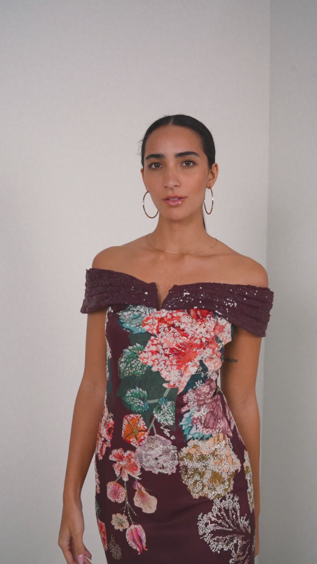 A head-turner from Ranna Gill’s Fall 2025 drop, the Glen Gown comes in wine crepe with an off-shoulder neckline and an elongating column silhouette. The floral print is set in coral, teal, and ivory which builds in richness from the bodice to the hem, layered with sequin detail for a hint of drama. The thigh-high slit adds just enough edge to the otherwise sleek frame. Designed to contour the body, it shapes and defines without feeling overdone. Whether you're headed to a rooftop birthday dinner or an evening out that calls for something striking, this piece brings the right amount of impact.
