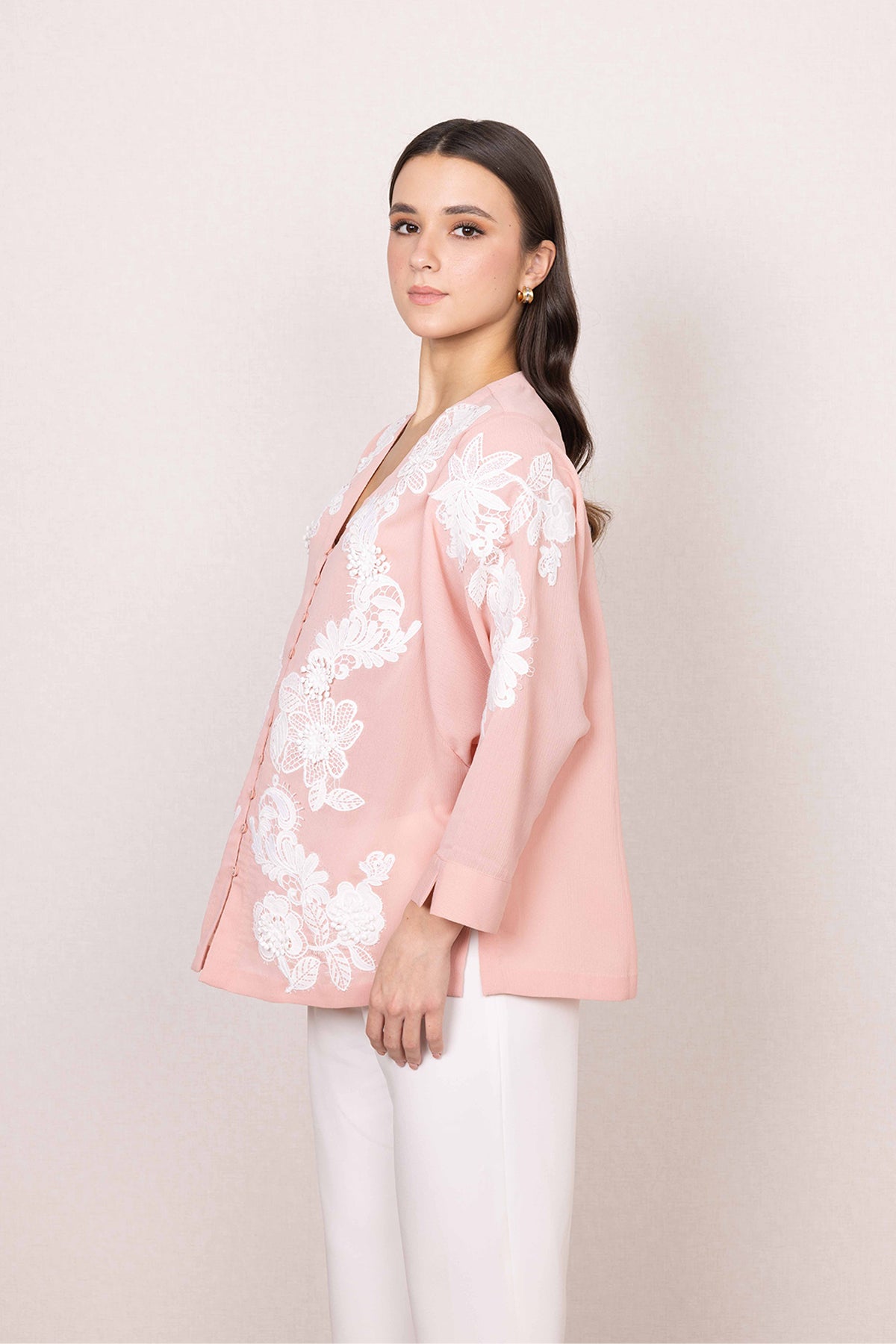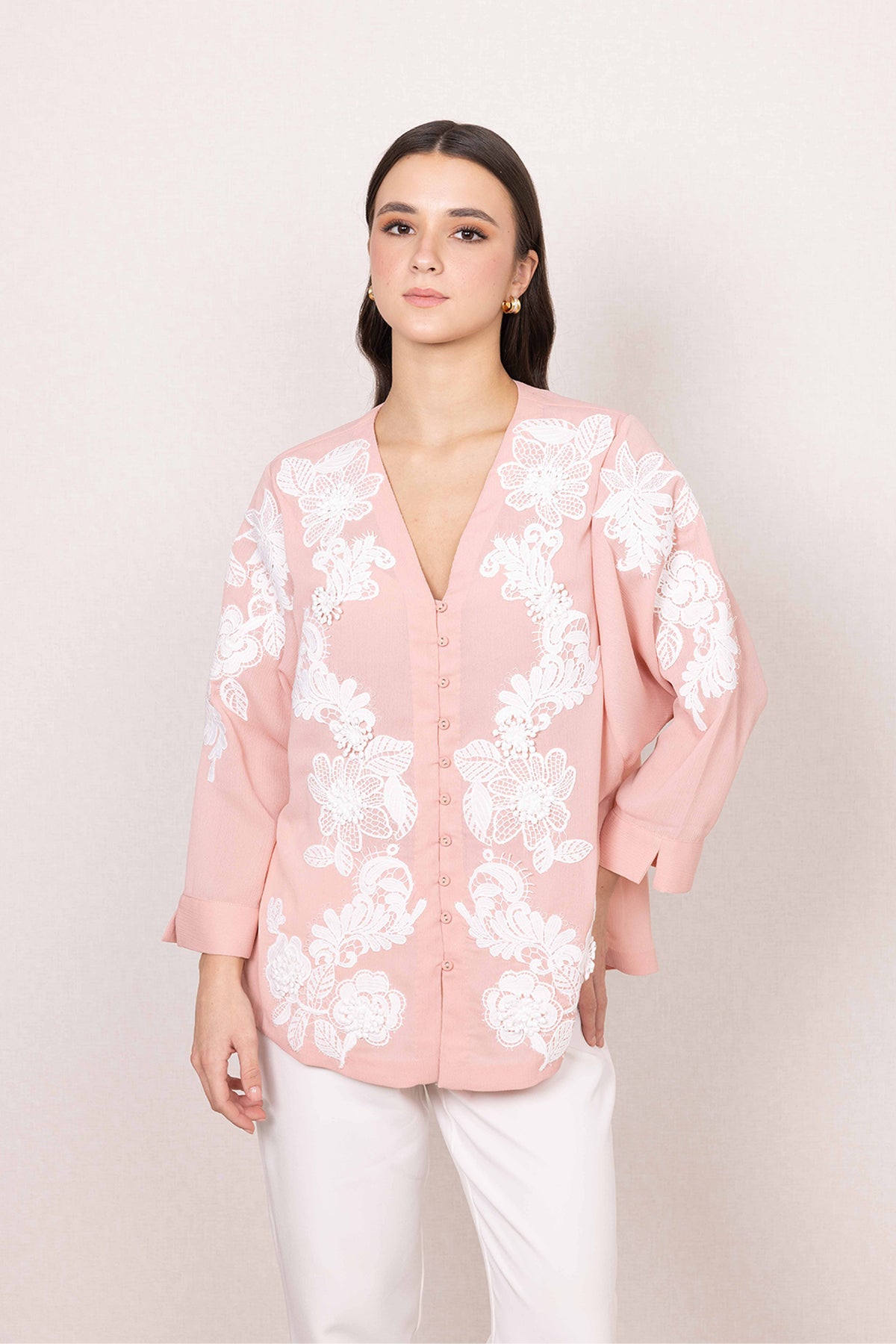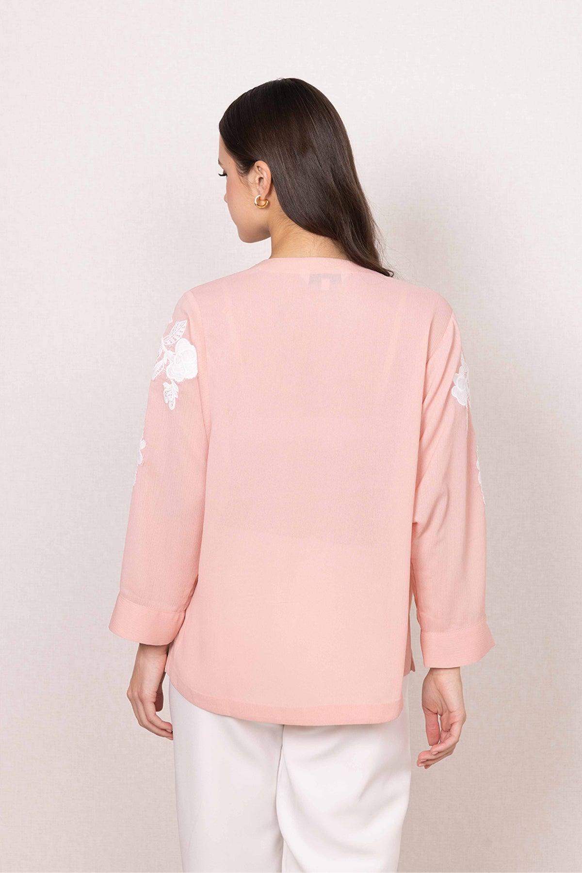 Soft colour sets the mood for the Zion Blouse, finished in a gentle blush pink that feels calm and elevated. Made in China crinkle georgette, the fabric brings a light texture that sits comfortably through the day. White floral embroidery flows across the front and sleeves, adding detail with a clean, balanced look.