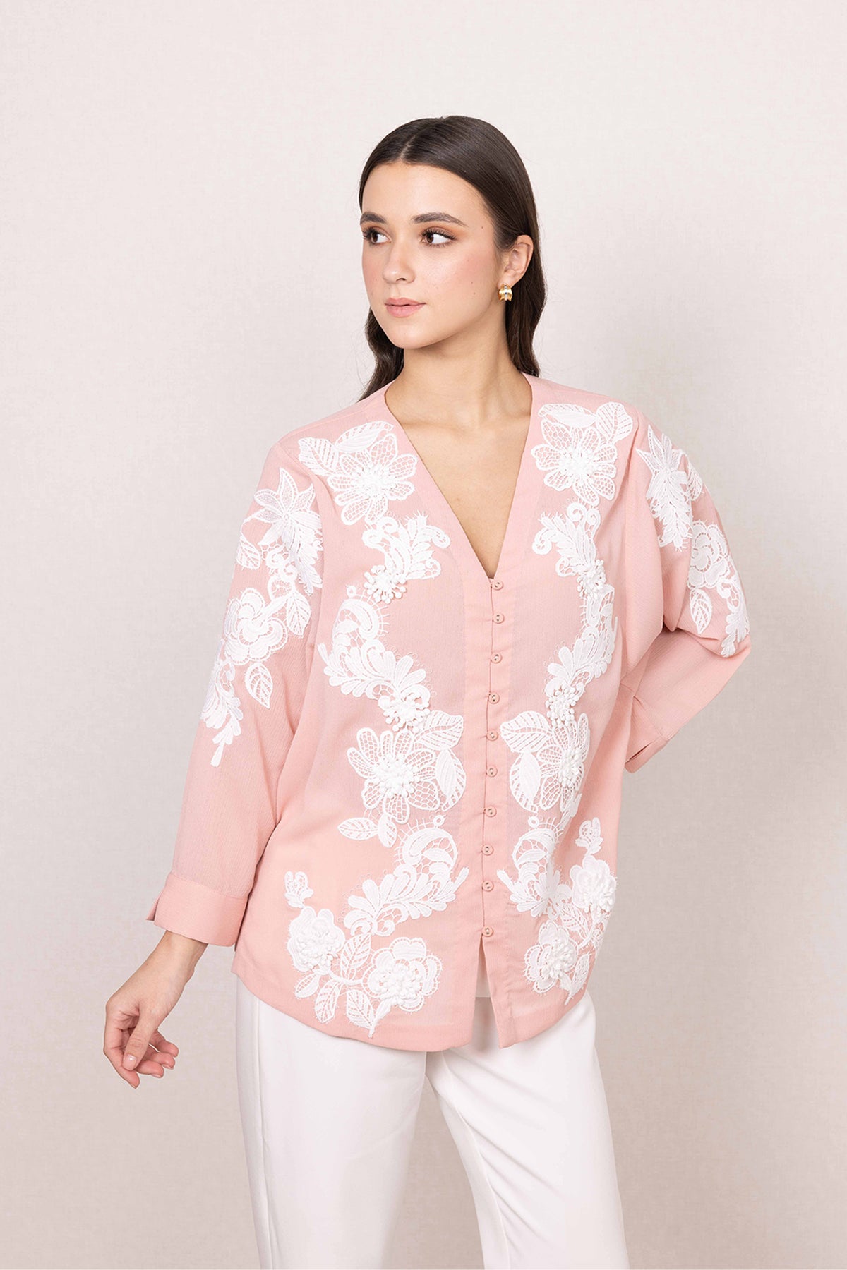 A V-neckline, button-down front, and relaxed sleeves complete a blouse that feels thoughtful and chic.