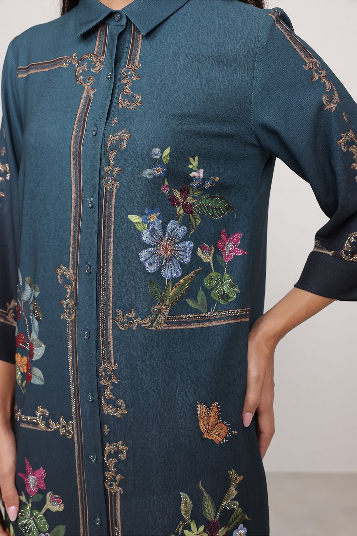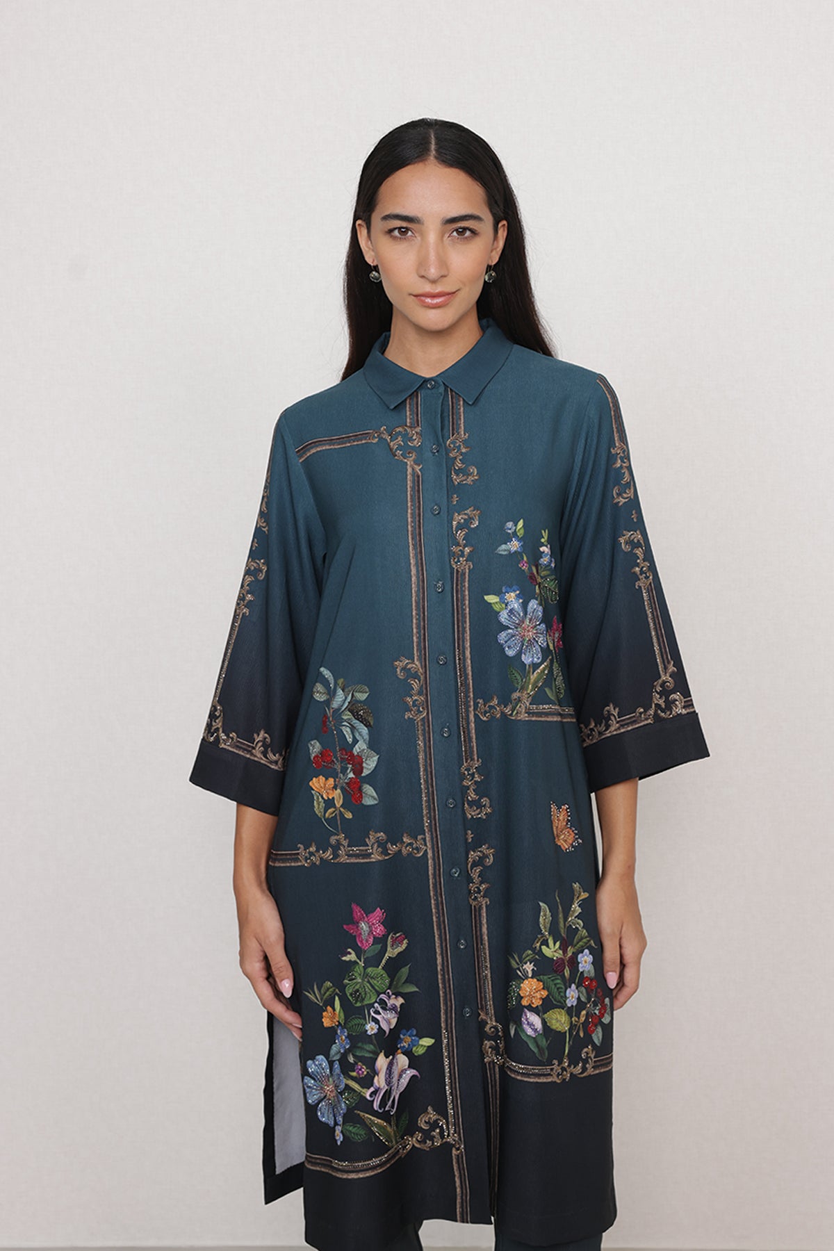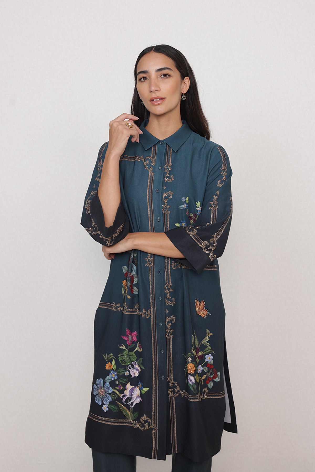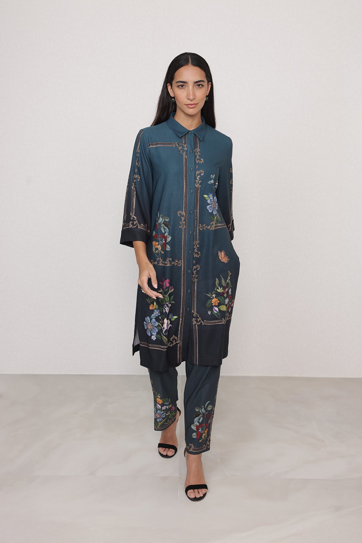 Ranna Gill Ziva teal printed button down tunic set in Poly Crinkle