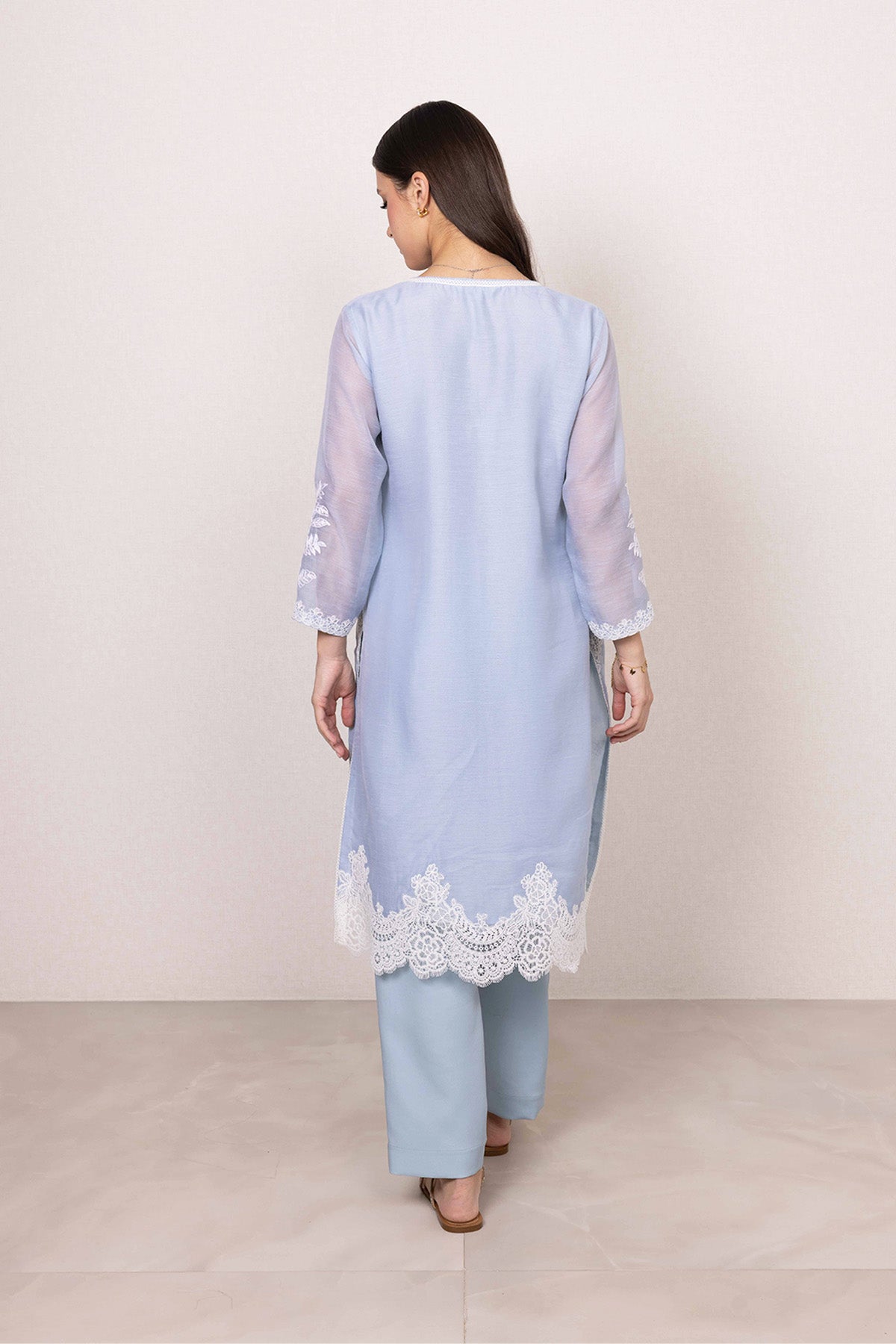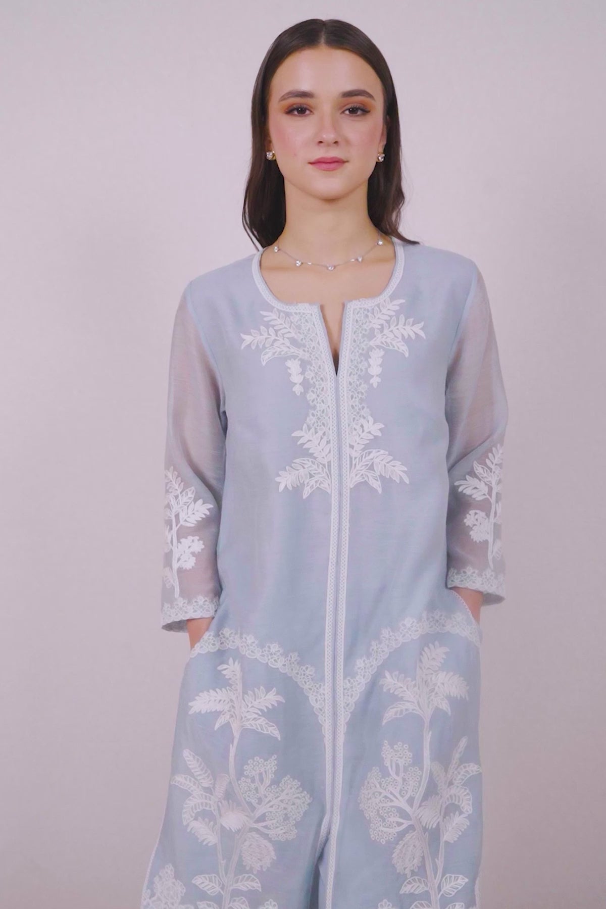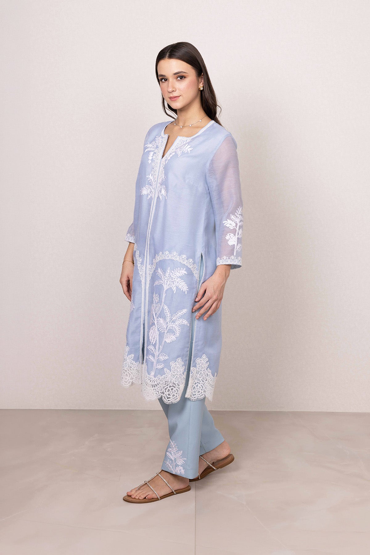 Ranna Gill's Jigsa Tunic Set comes in powder blue Dhaka Linen, offering a soft and airy feel. The tunic features intricate white floral embroidery across the front, sleeves, and hem, complemented by delicate lace detailing along the border and neckline placket. A long silhouette with a front slit adds a graceful touch, while the matching blue trousers are finished with subtle embroidered accents. A beautiful choice for daytime gatherings and relaxed celebrations