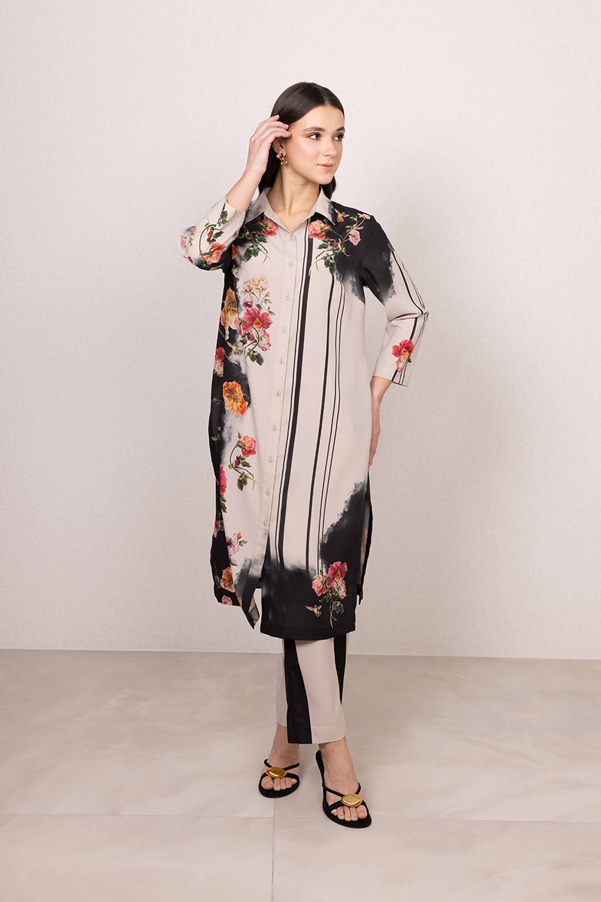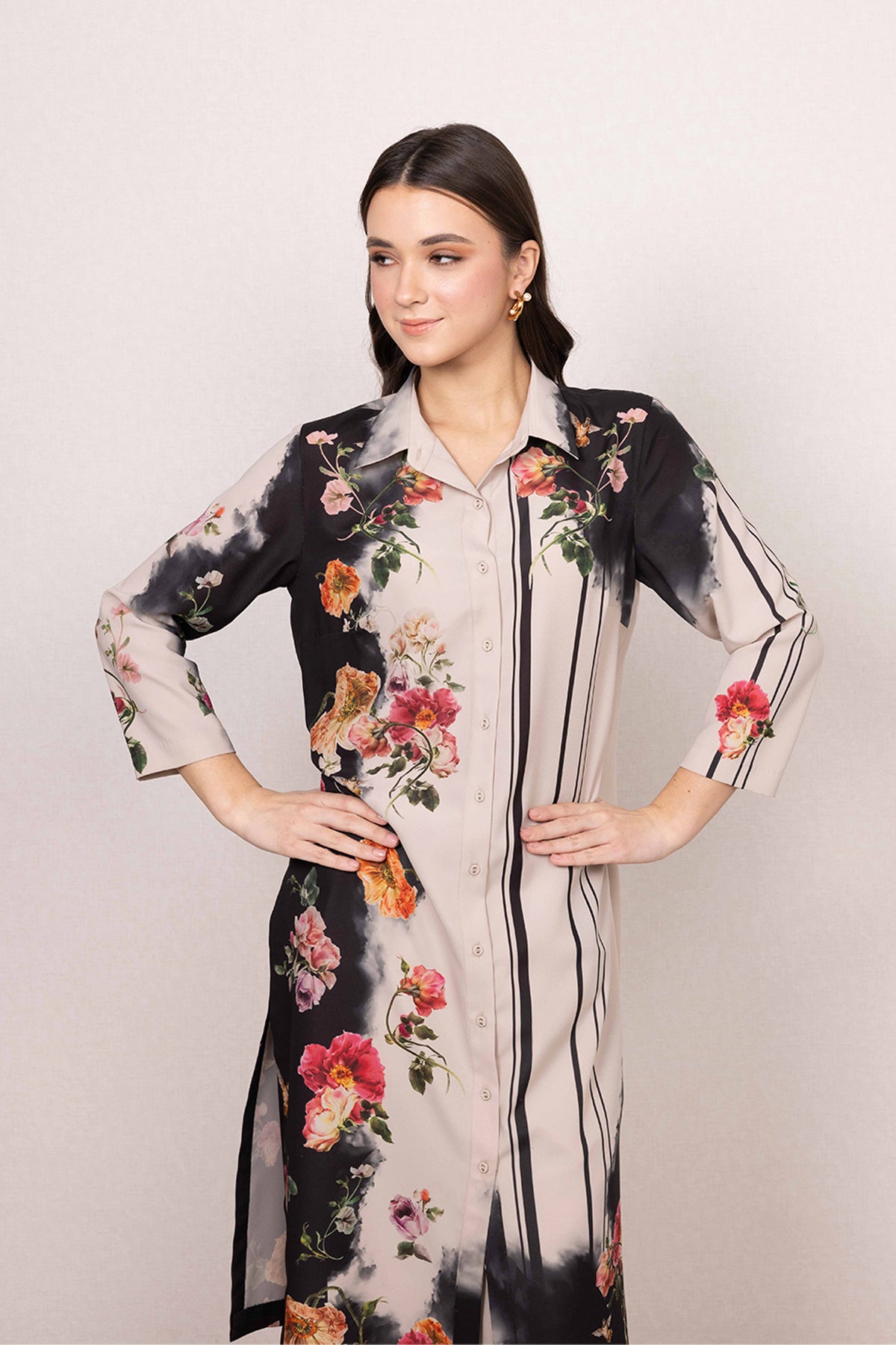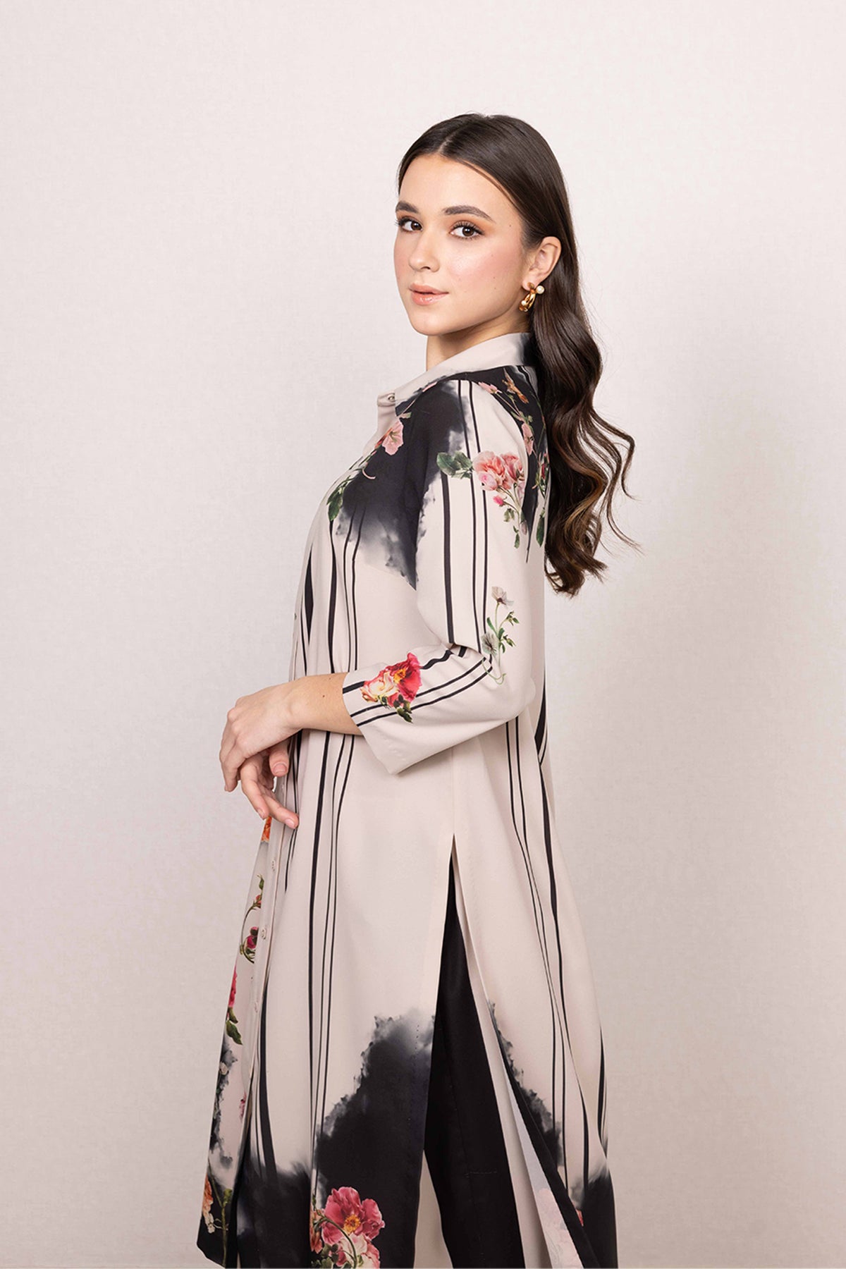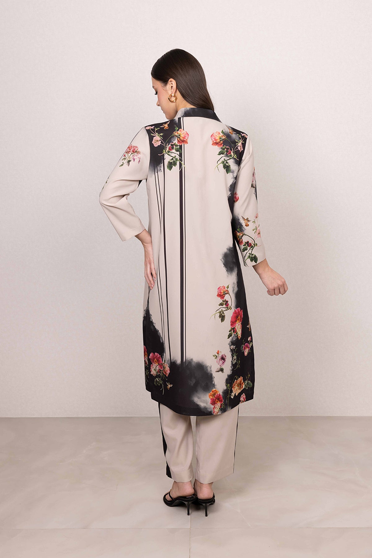 Defined by contrast and clean detailing, Ranna Gill's Terra Tunic Set brings a fresh direction to printed dressing. The tunic features floral placements across black and sand beige panels, a structured button-down front, and three-quarter sleeves. Coordinated straight pants mirror the floral accents and include functional side pockets for added practicality.
