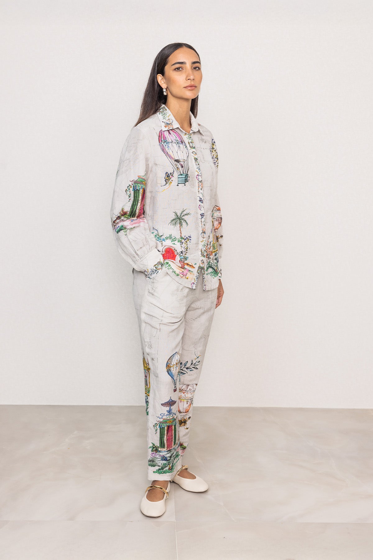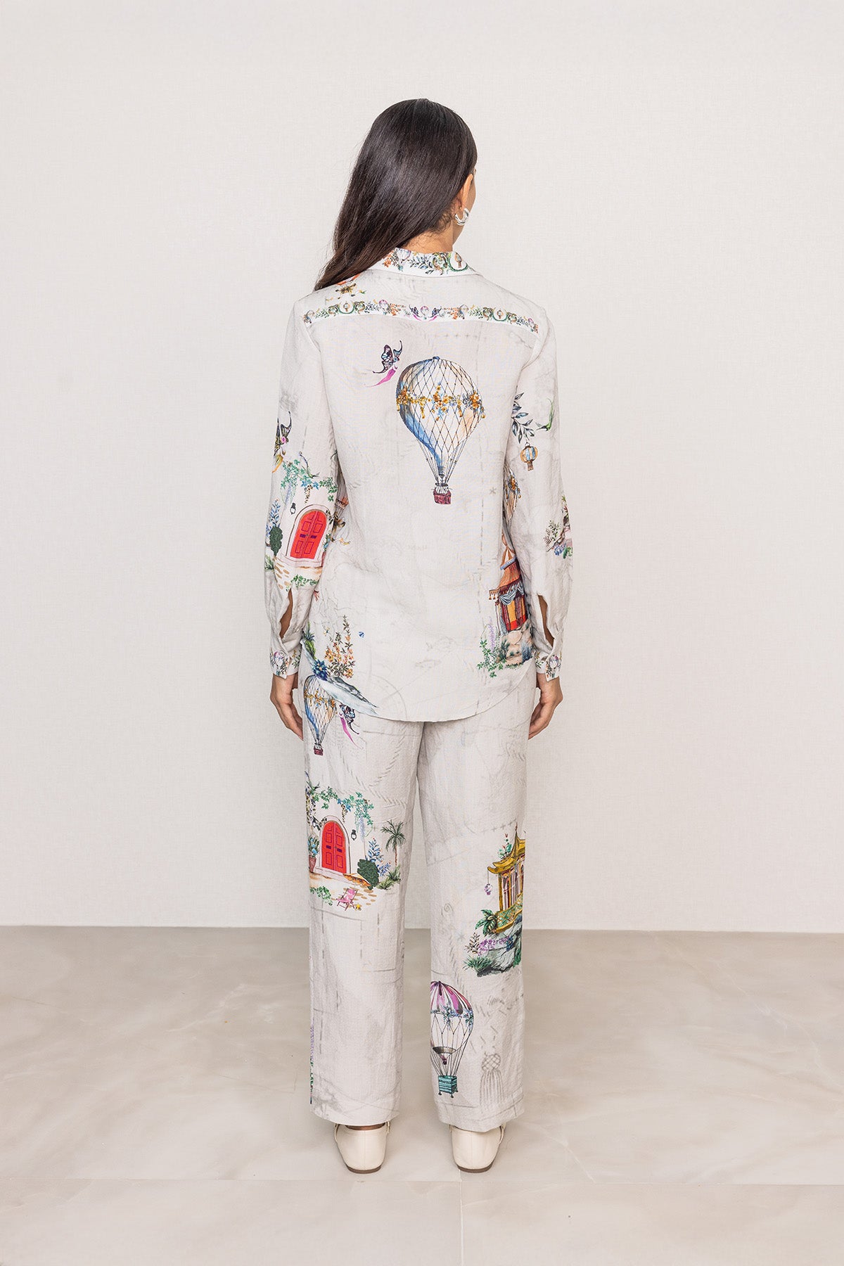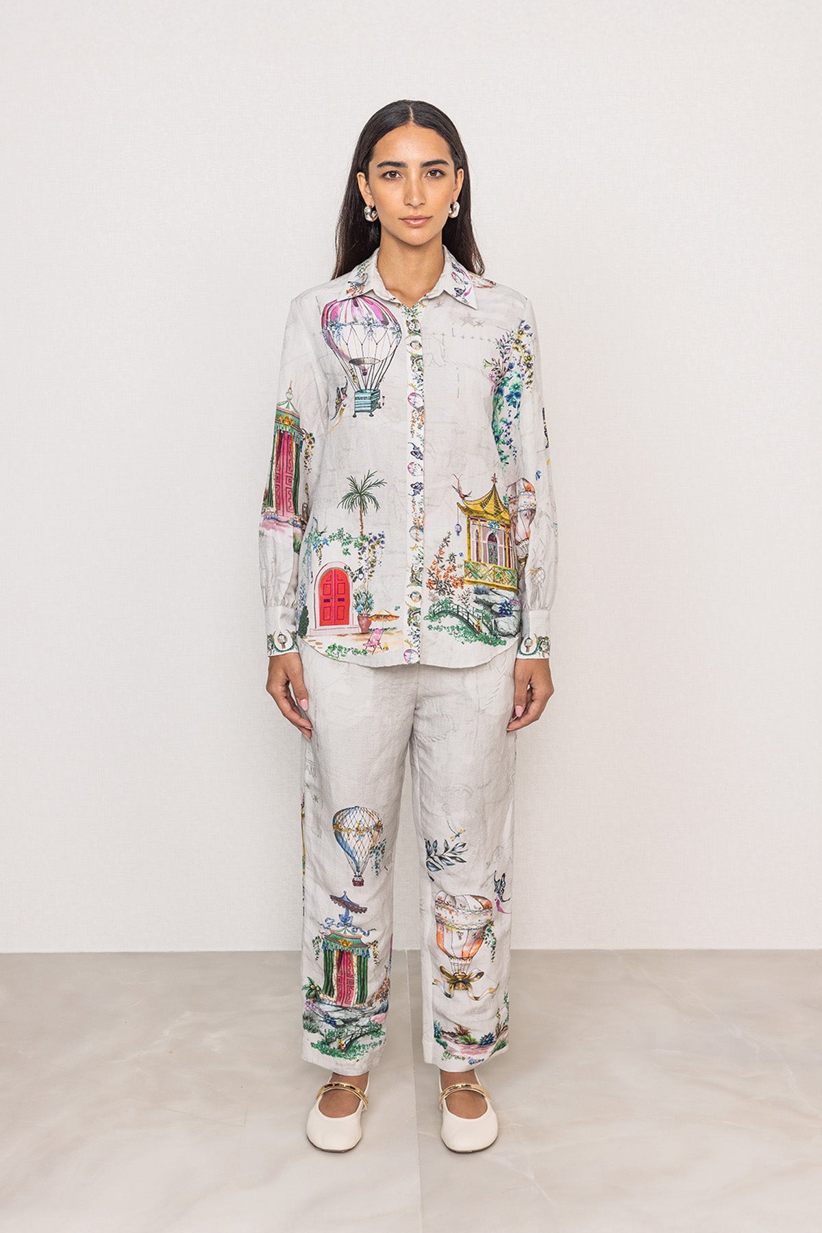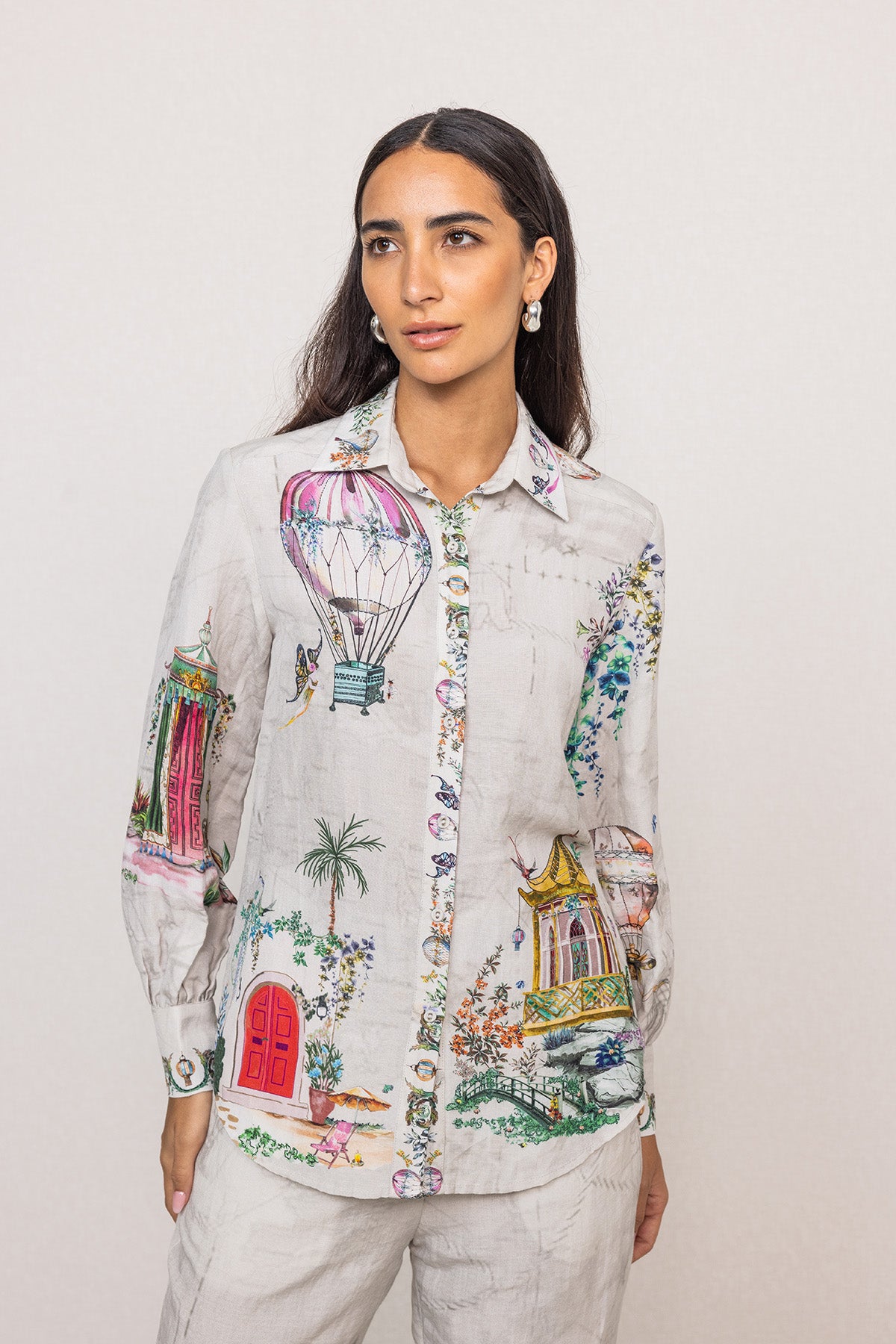 Featuring the Finch Buttondown Shirt comes in a soft Grey tone, crafted from breathable linen viscose. Cut with long sleeves, it features a classic pointed collar, full button-down front, and cuffed sleeves that give the shirt a clean, structured look. The Cappadocia print unfolds across the fabric with detailed artwork of hot air balloons, arched doors, pavilions, and botanical elements, placed thoughtfully to stand out against the muted base.