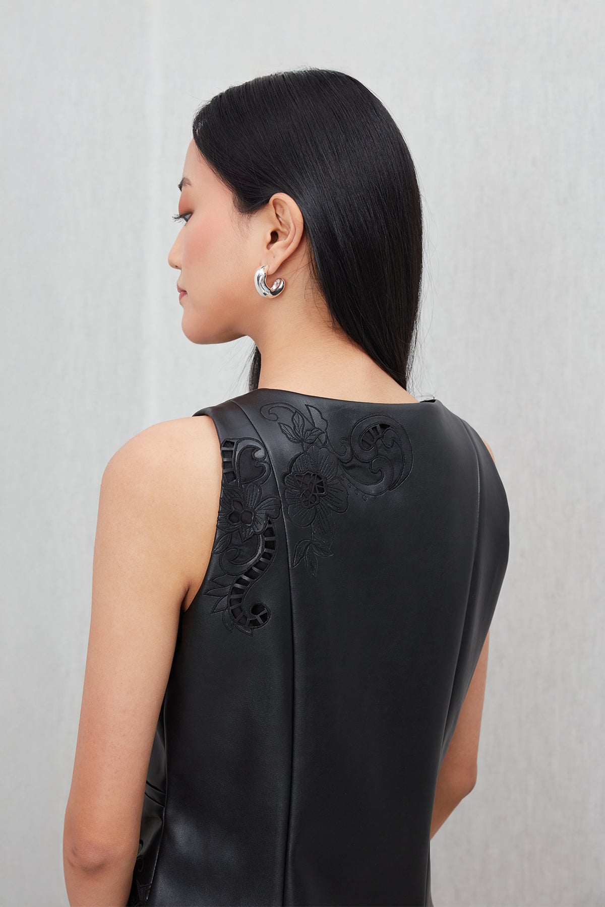 Defined by sharp lines and a strong shoulder, Ranna Gill's Vera Waist Coat in black faux leather features thread embroidery along the neckline and hem. The floral motifs are tonal and subtle, stitched in fine thread that plays with texture. Its structured cut creates a neat cinch at the waist with a wrap-over finish. Pair it up with the Viola skirt for a more polished look.