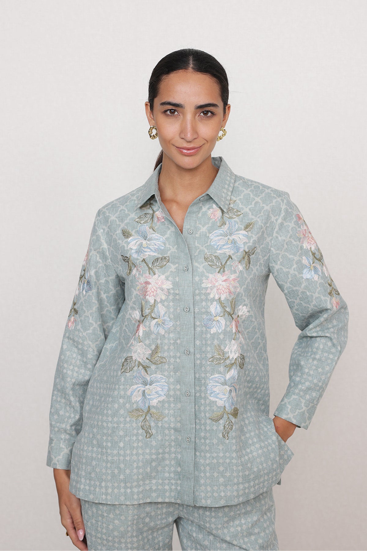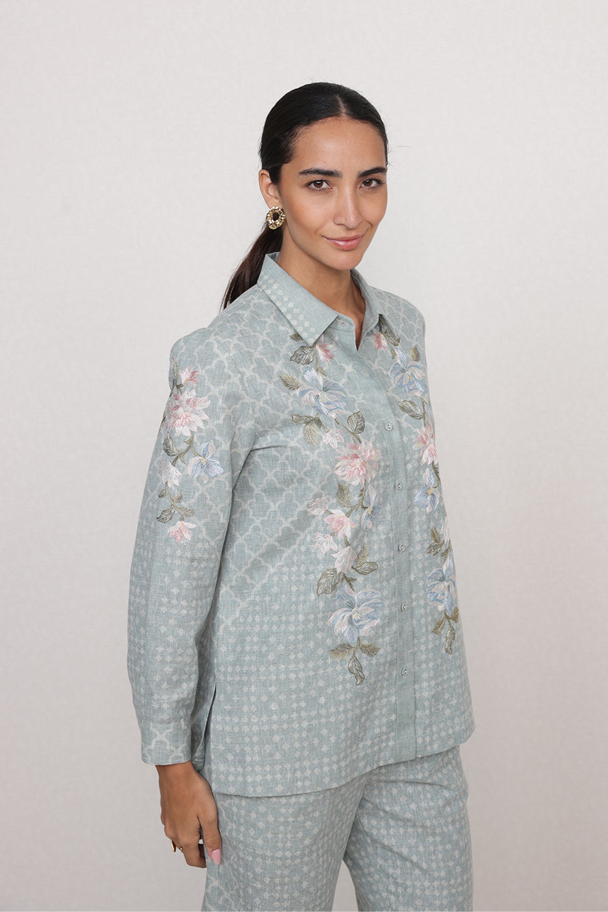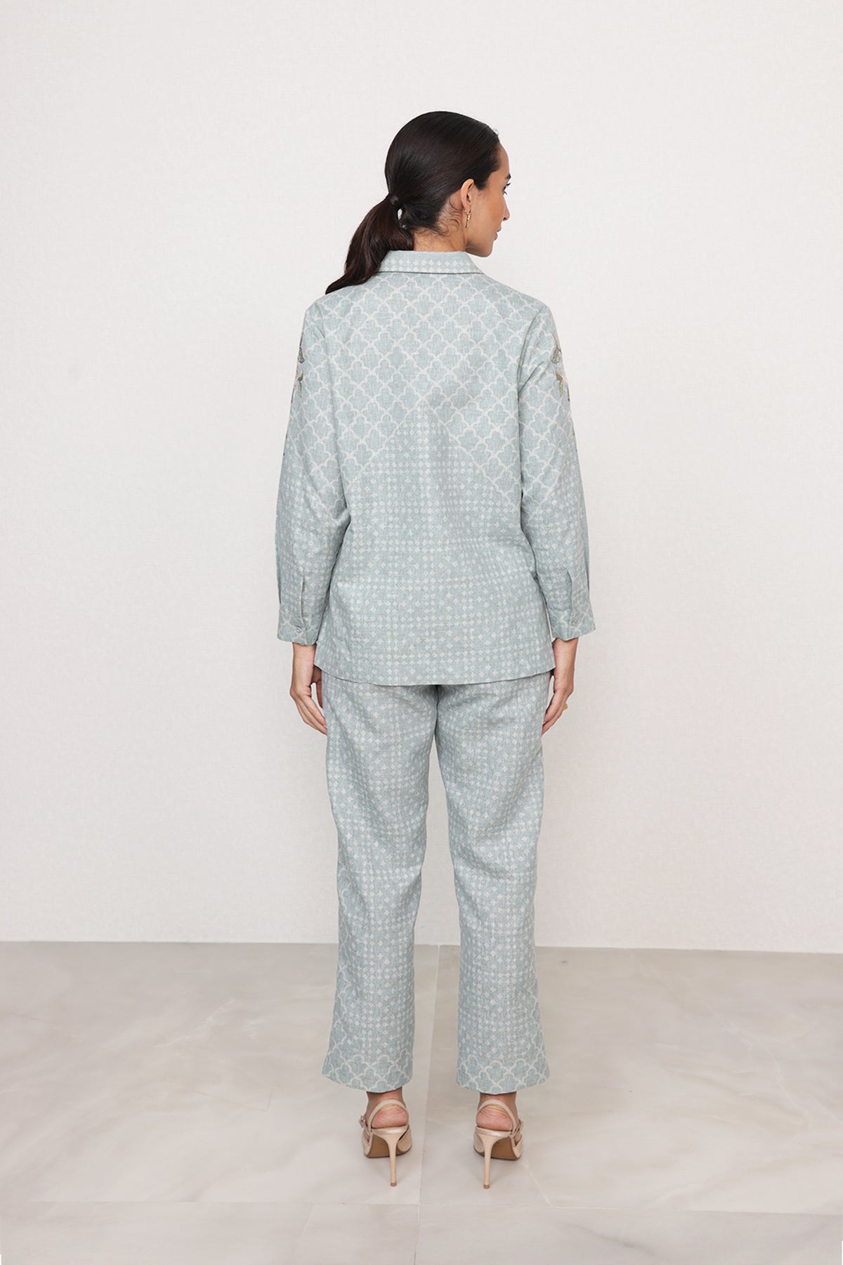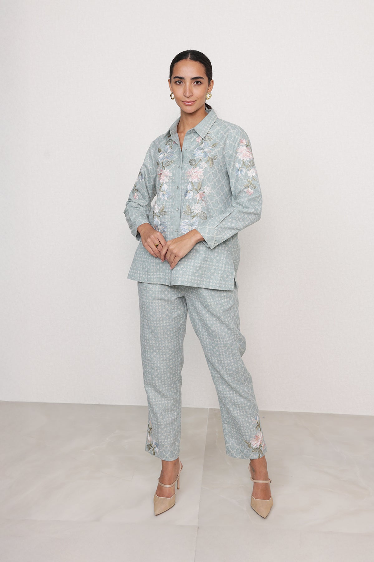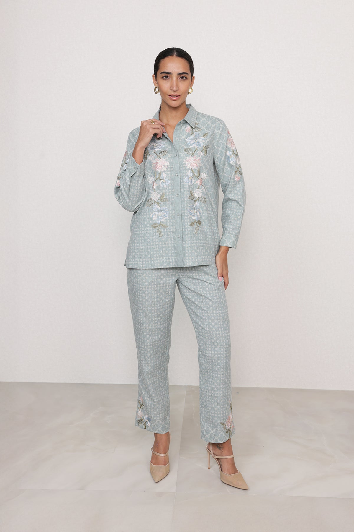 Soft structure meets everyday polish in Ranna Gill's Arlone Co-Ord Set, made to feel instantly put together. Cut in fluid Poly Flex, this sage blue set features pastel floral prints layered over a subtle all-over pattern. The shirt-style top is detailed with a clean collar, button front, and full sleeves for a balanced look.