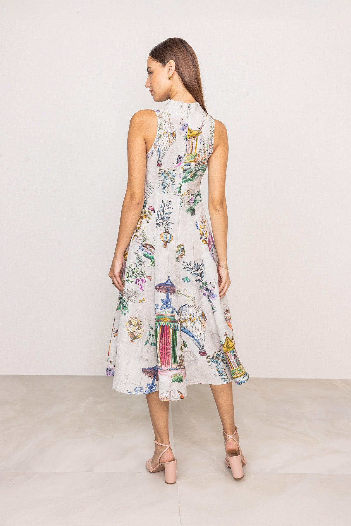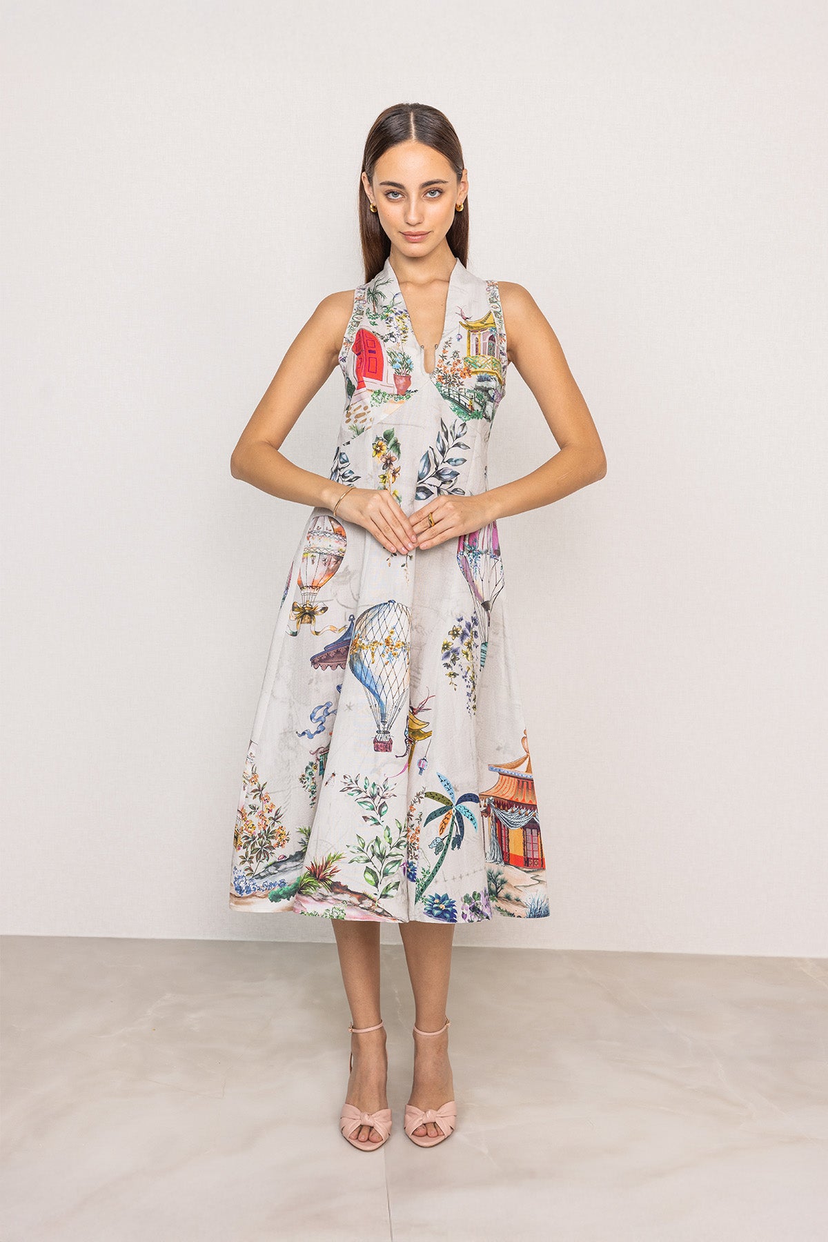 A silhouette designed for days that unfold slowly, the Auri Halter Midi Dress is made in fluid linen viscose in a soft grey base. Cut sleeveless with a halter neckline and a clean V-shaped opening, the bodice sits neatly before flowing into a gently flared midi length. The Cappadocia print is brought to life through detailed artwork of hot air balloons, arches, foliage, and scenic elements placed across panels for visual balance. Finished with functional side pockets, the dress moves naturally with the body, offering a relaxed fit that feels light, breathable, and thoughtfully detailed from every angle.