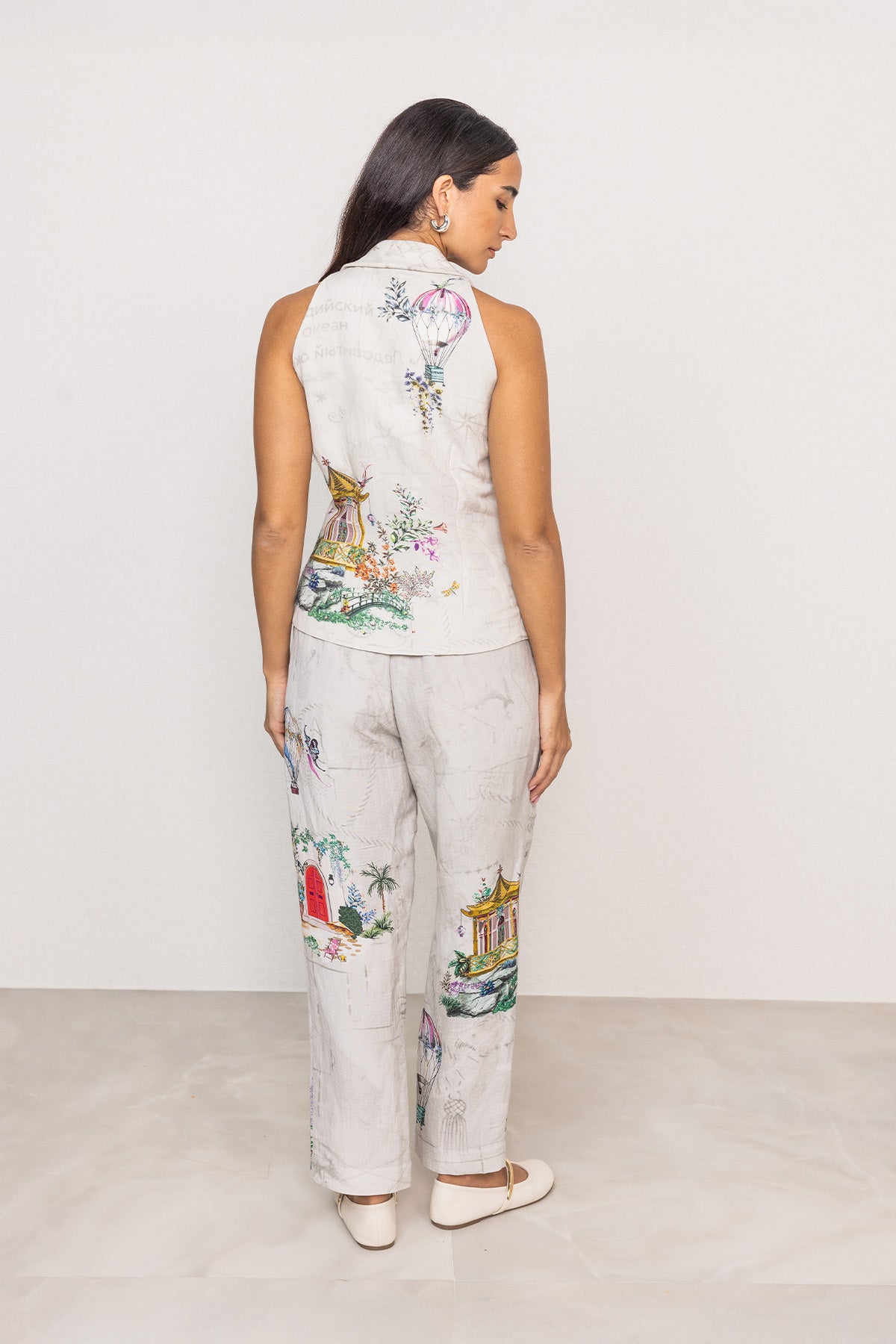 Introducing the Kea Halter Waist Coat, where tailored structure is brought to life through thoughtful detailing and print. Set on a soft grey base, the Cappadocia print appears like illustrated panels, unfolding gently across the front and sides. Made in linen viscose, this sleeveless design features a halter neckline with sharp lapels and a clean V-front finished with button detailing. Pair it with Ranna Gill's Lyra Rara Pant for a complete look.