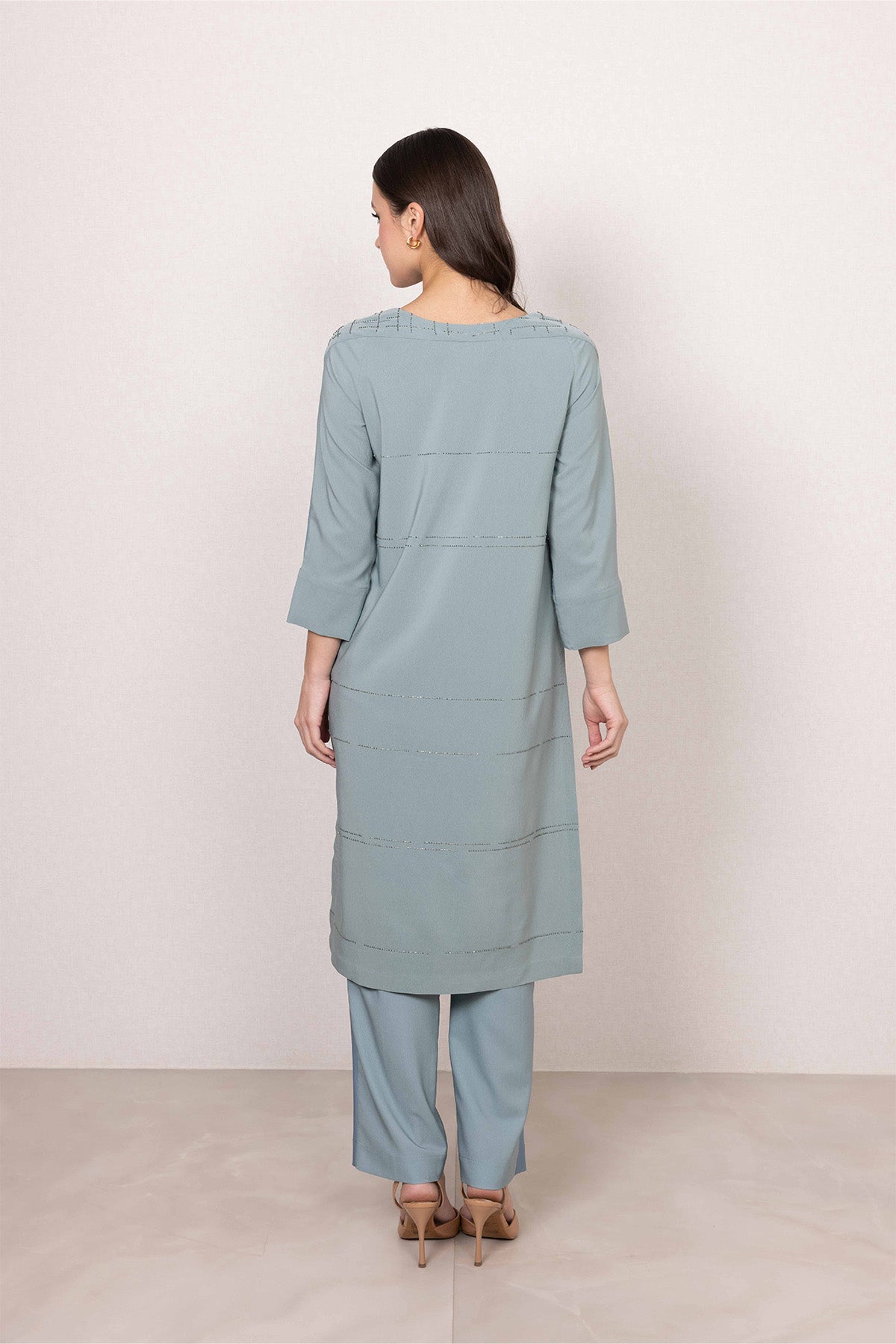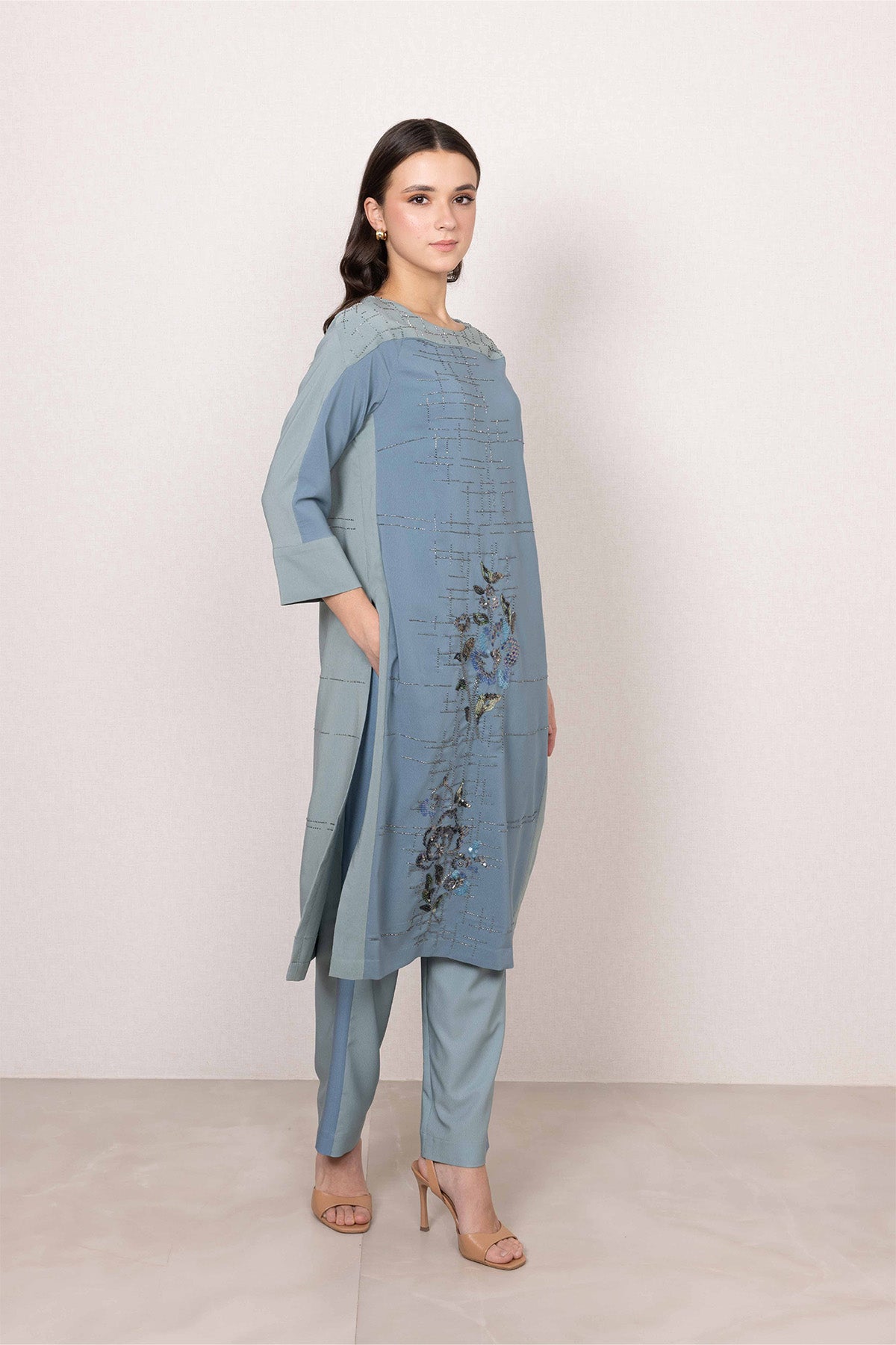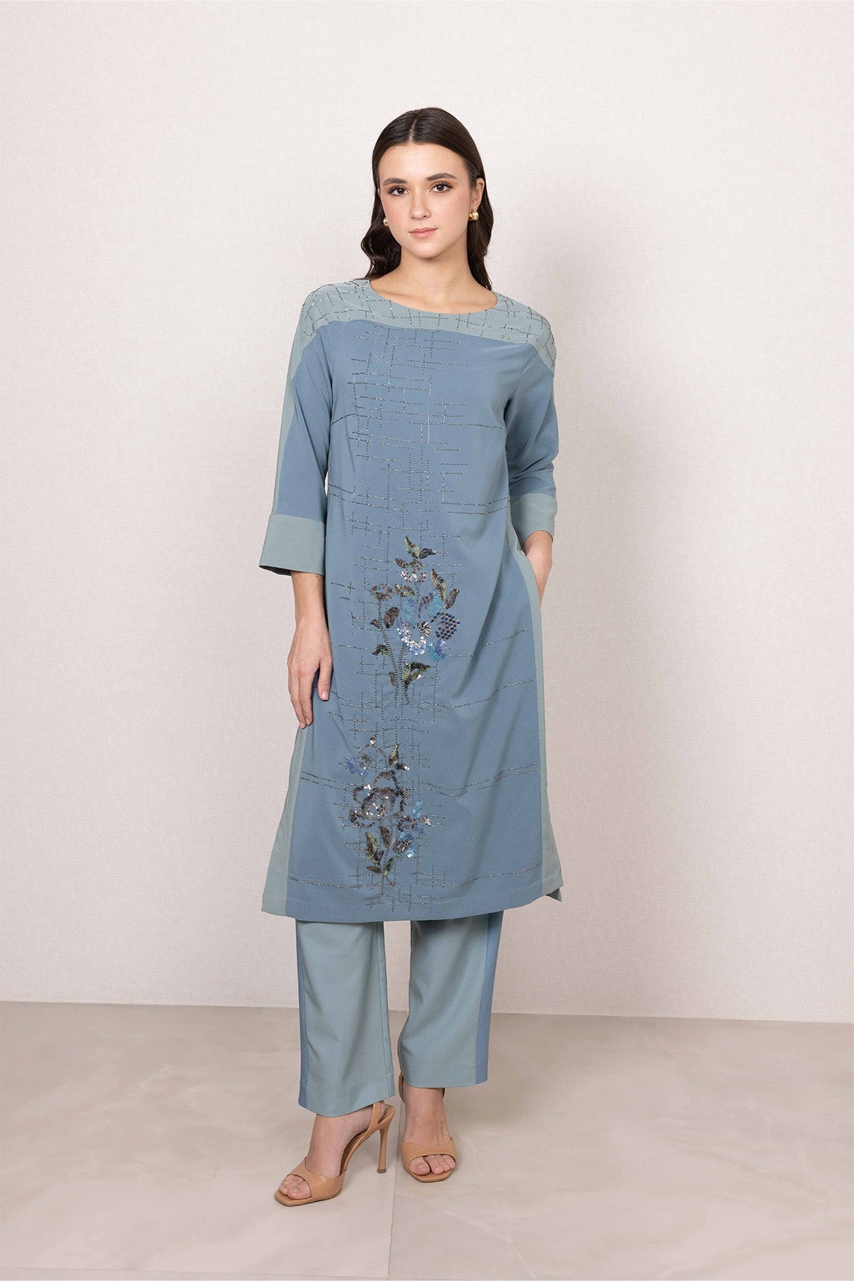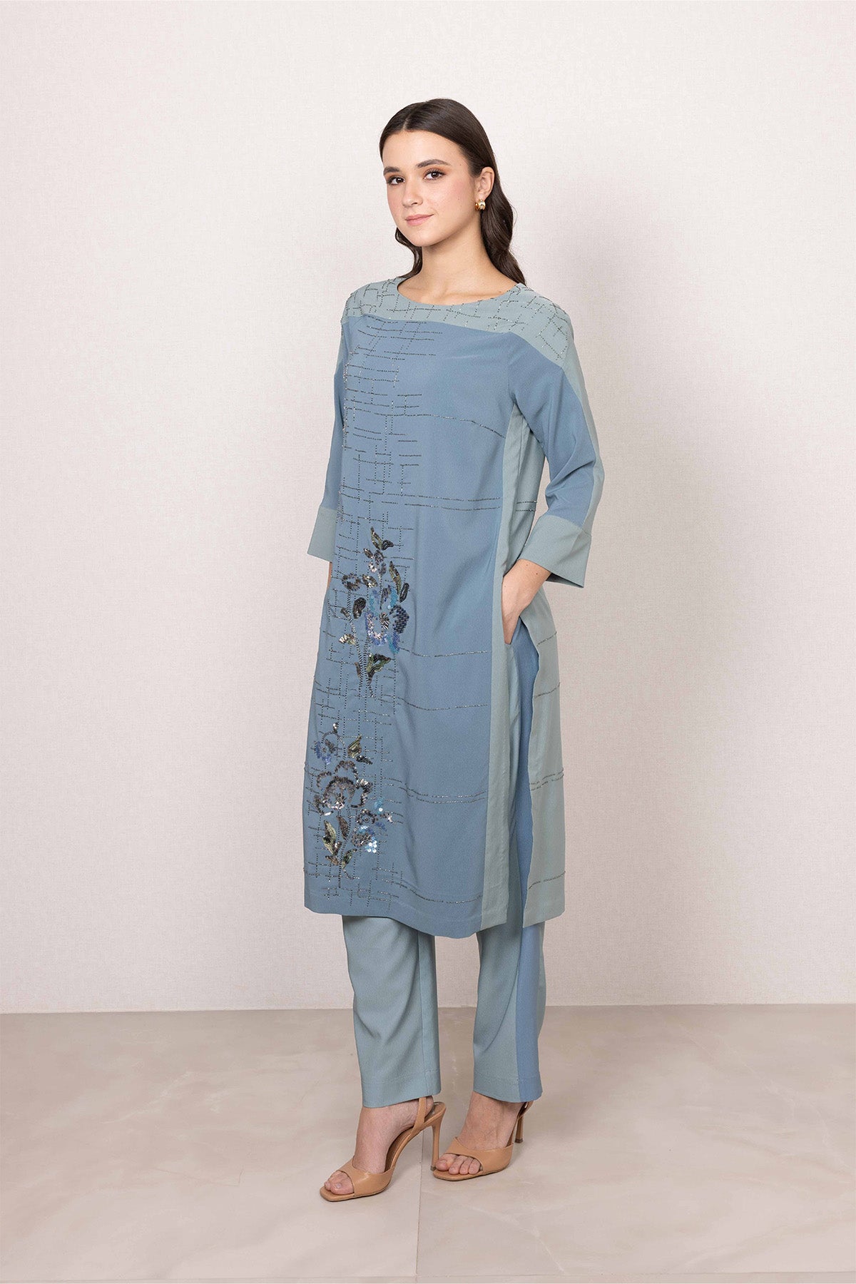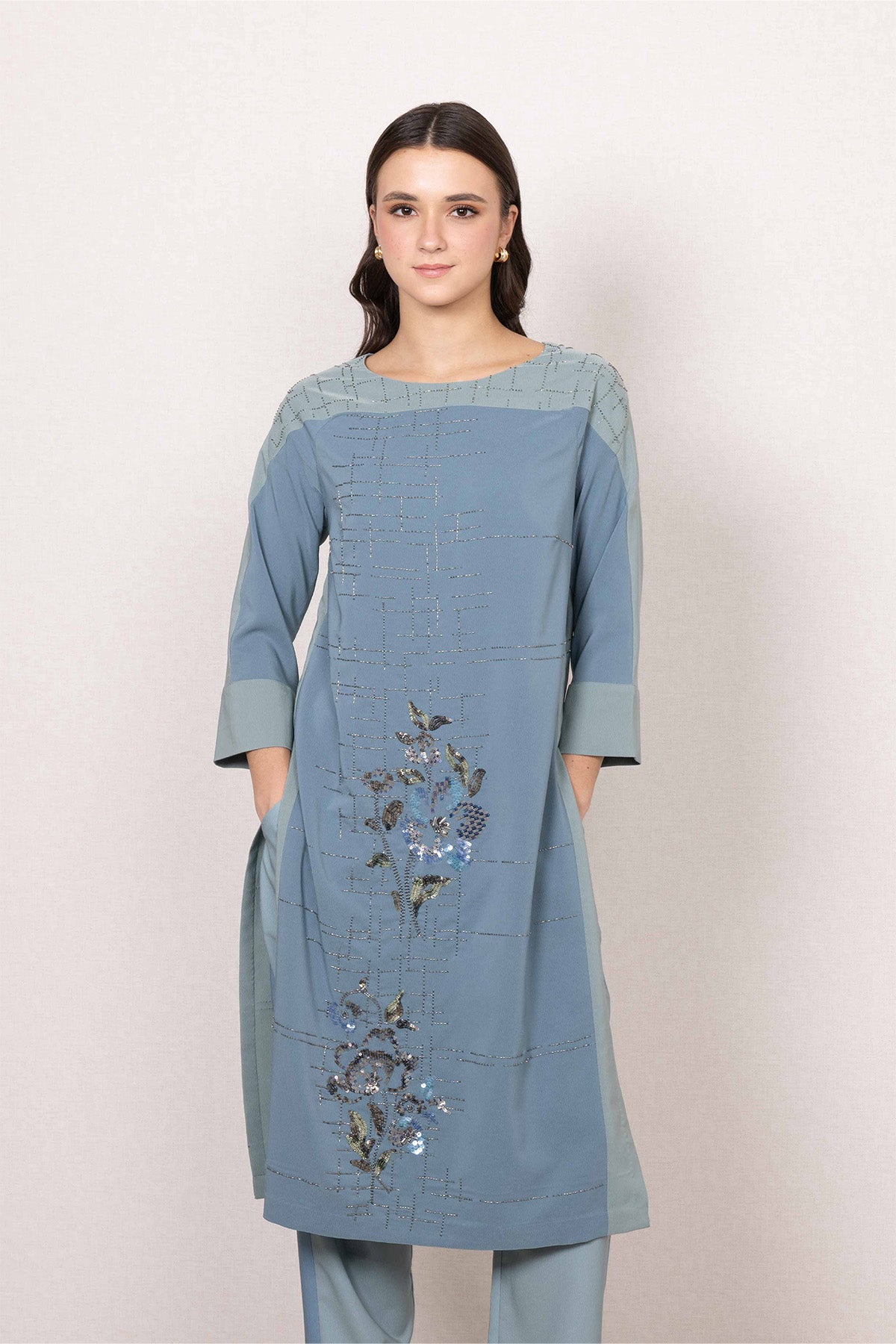 A quiet standout in soft sage blue, the Althe Tunic set brings a fresh, modern feel to day dressing. Made from lightweight Poly Crinkle, it features a subtle linear print across the base, with floral artwork blooming along the front panel. The straight silhouette, round neckline, and three-quarter sleeves create a clean, flattering shape, while side slits and pockets add everyday practicality. A graceful piece that feels special the moment you put it on.