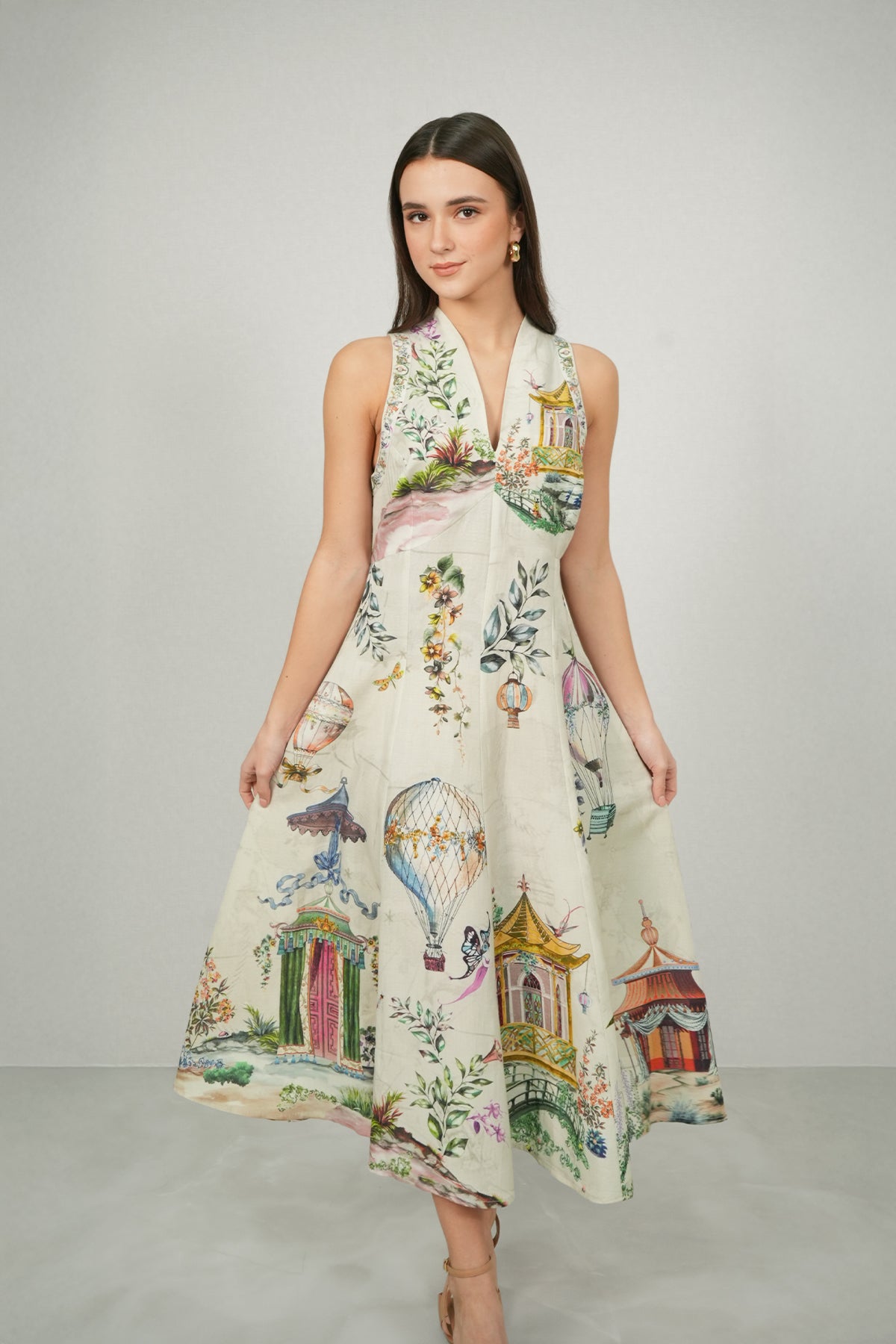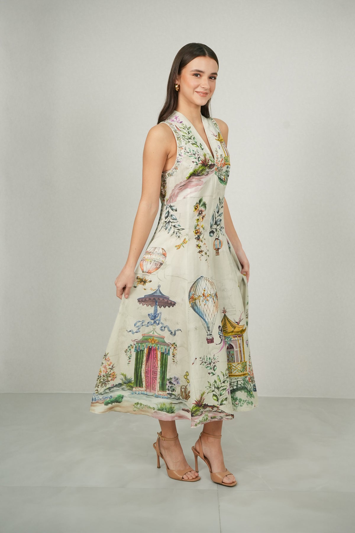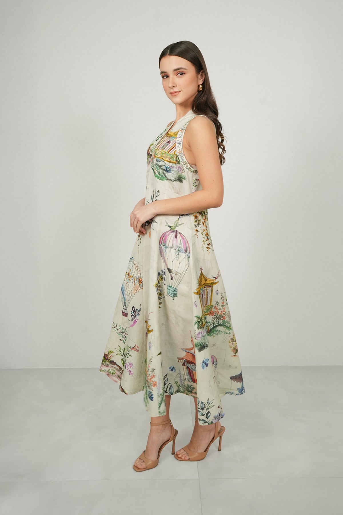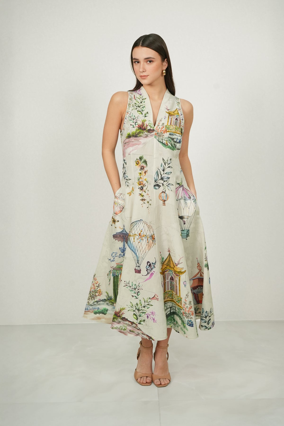 A silhouette designed for days that unfold slowly, the Auri Halter Midi Dress is made in fluid linen viscose in a soft grey base. Cut sleeveless with a halter neckline and a clean V-shaped opening, the bodice sits neatly before flowing into a gently flared midi length. The Cappadocia print is brought to life through detailed artwork of hot air balloons, arches, foliage, and scenic elements placed across panels for visual balance. Finished with functional side pockets, the dress moves naturally with the body, offering a relaxed fit that feels light, breathable, and thoughtfully detailed from every angle.