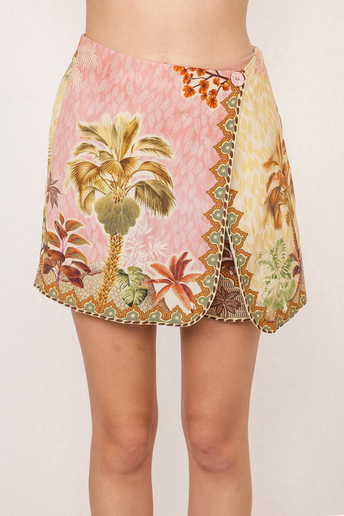 Made to look like a skirt with the comfort of shorts, Ranna Gill's Elin Overlap Skorts bring a playful twist to printed dressing. Cut in linen viscose, this wrap-style design features an overlap front with a button fastening and scalloped hemline highlighted by the Costa Rica print. The multicolour print placement frames the silhouette, while the structured waist ensures a flattering fit.