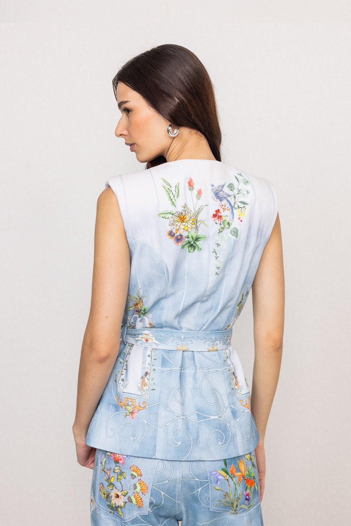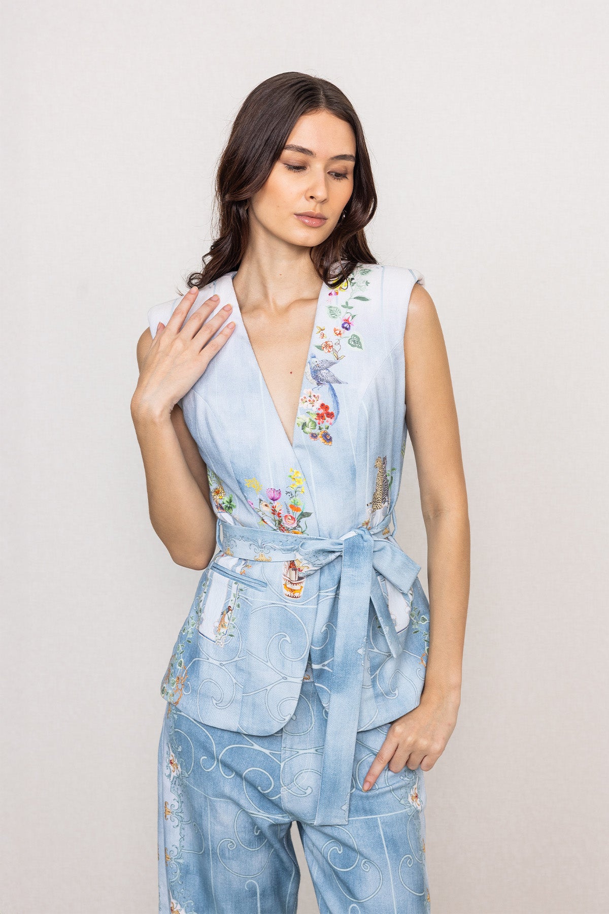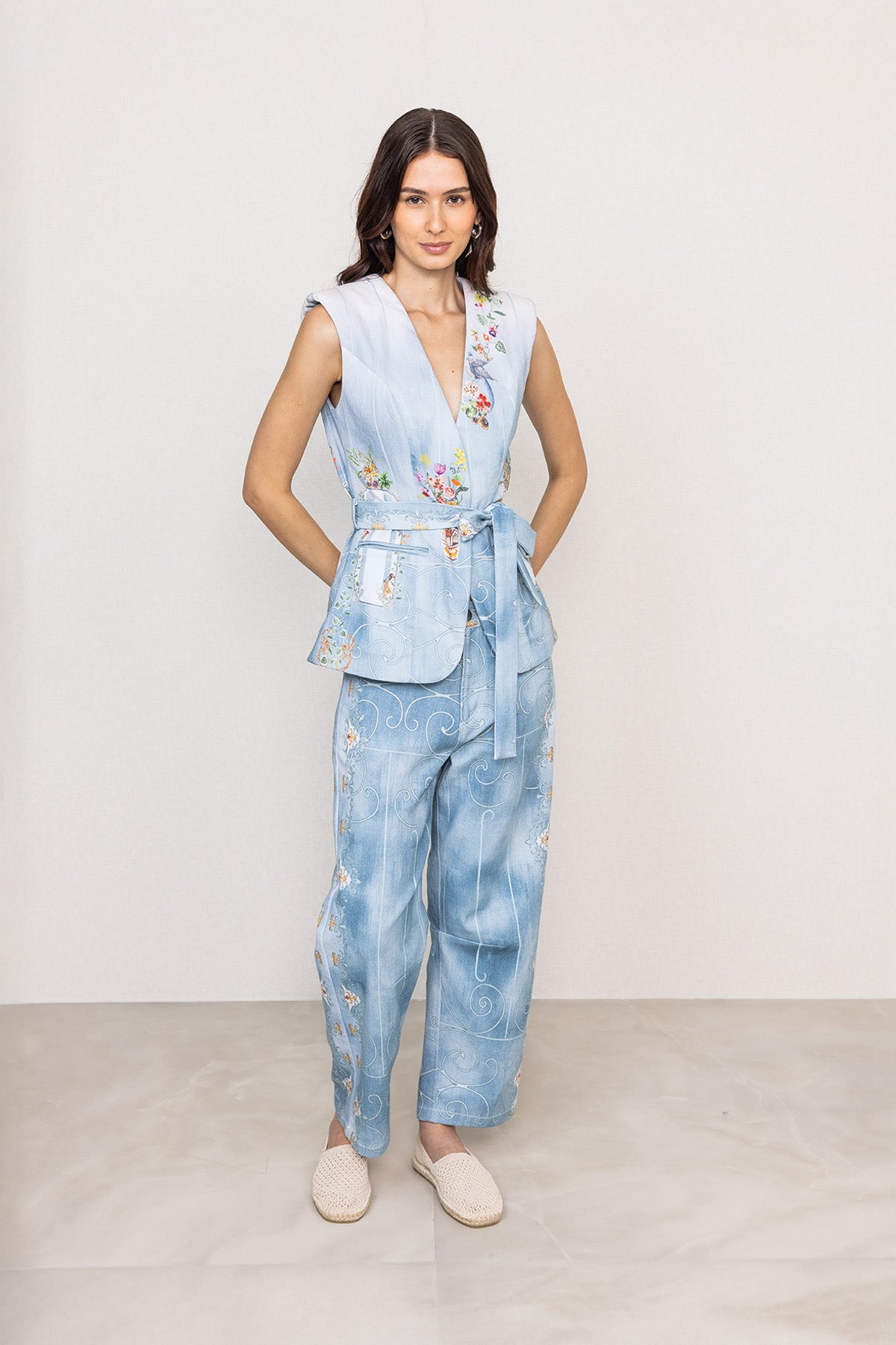 Introducing Ranna Gill's Rafia Belted Waist Coat, made in blue denim and finished with the Trellis print, giving it a composed yet modern presence. The deep V neckline keeps the front clean, while panelled seams and a wrap-style belt define the waist with quiet structure. Sleeveless and balanced in shape, it works well for long travel days, casual meetings, or evenings spent walking through streets.