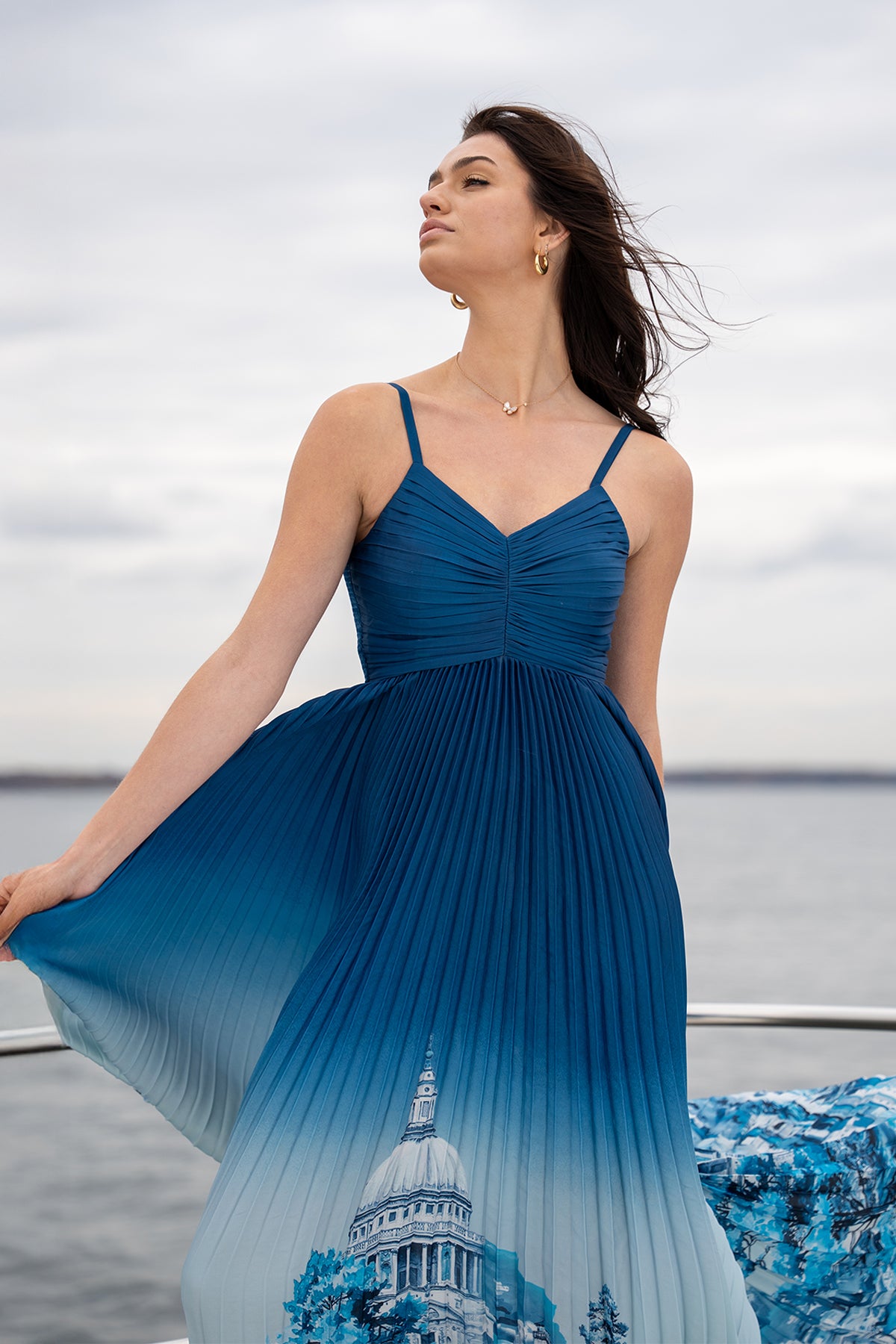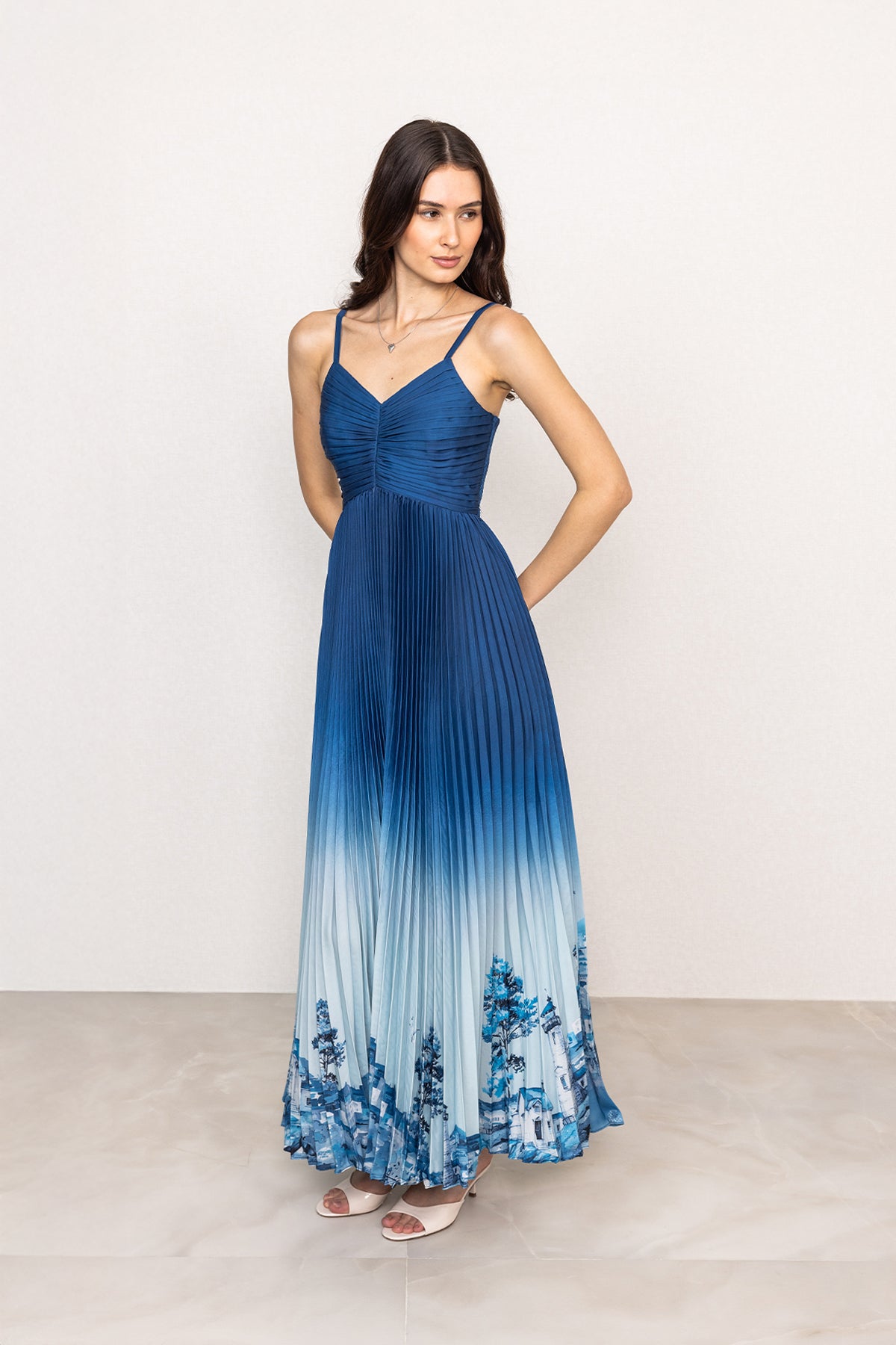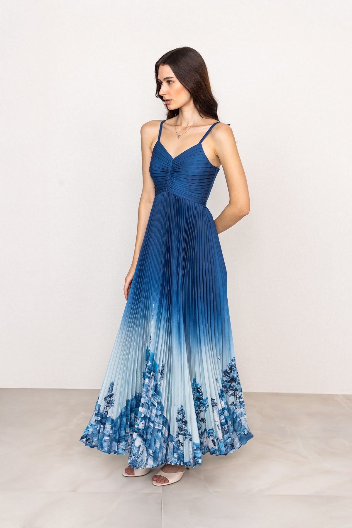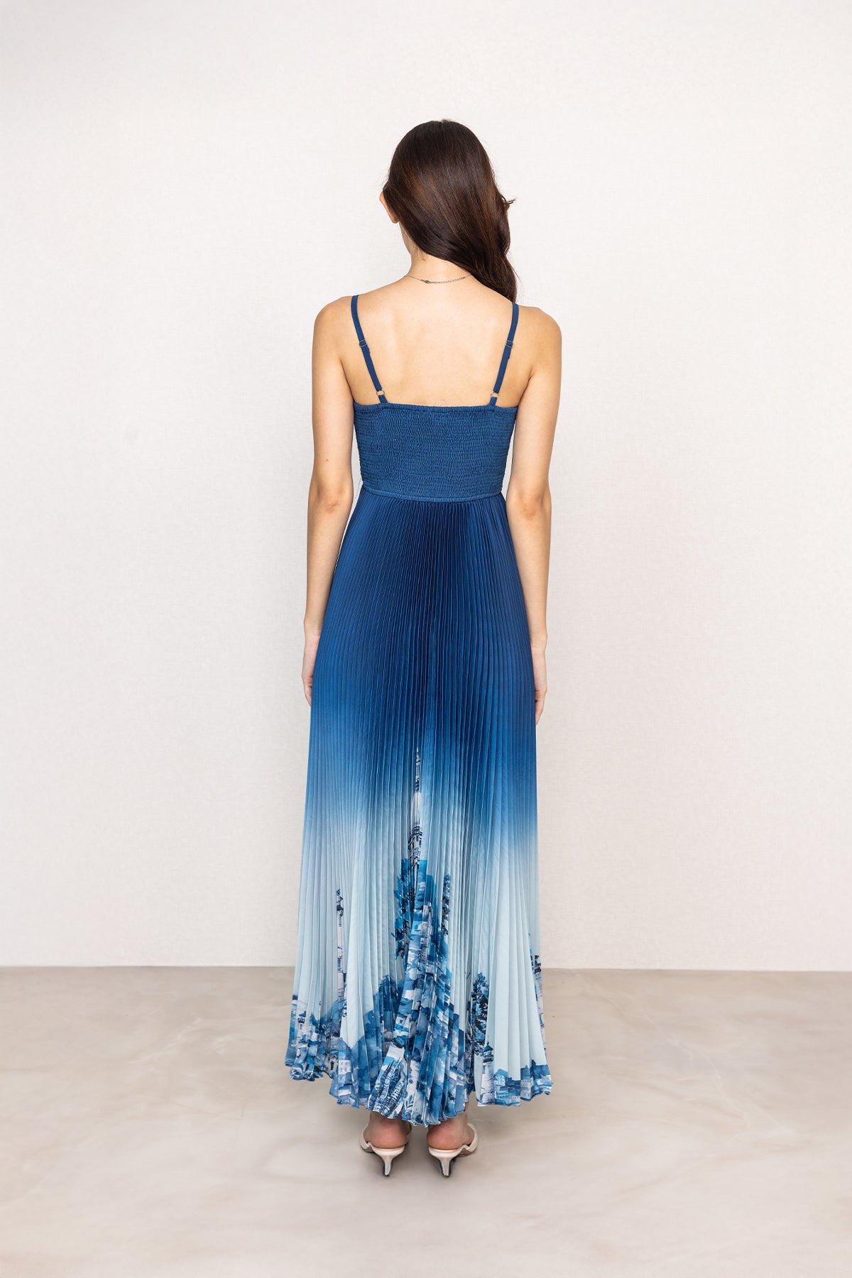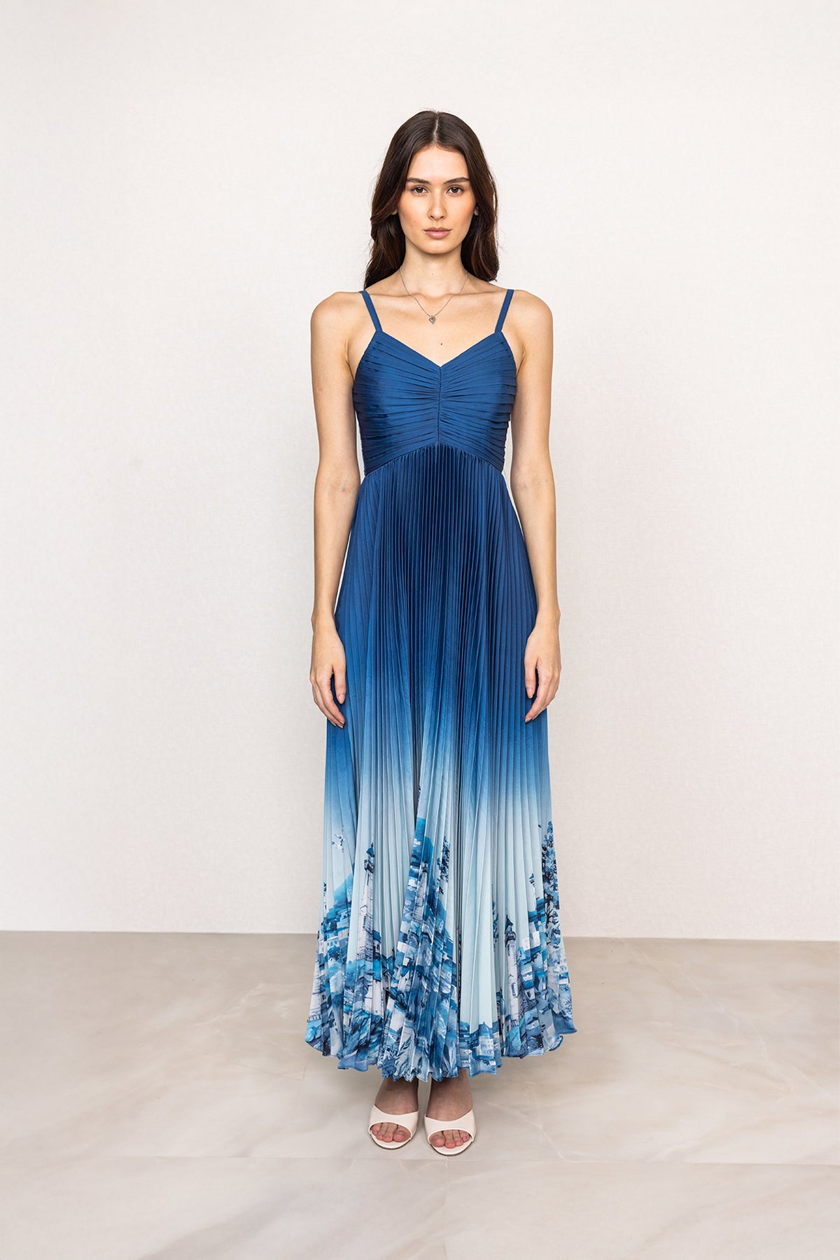 Designed to flow with a clean, elongated silhouette, the Comet Strap Pleated Maxi Dress is crafted in smooth poly satin for a soft sheen and fluid fall. The deep blue ombré base transitions gently into lighter tones, framing the Rome print with architectural artwork placed along the hem. Featuring a sleeveless design with fine shoulder straps and a softly ruched V-neckline, the bodice offers a shaped fit through the torso. Finished with finely set pleats from the waist down, the skirt falls evenly, creating a balanced, graceful drape as you move.