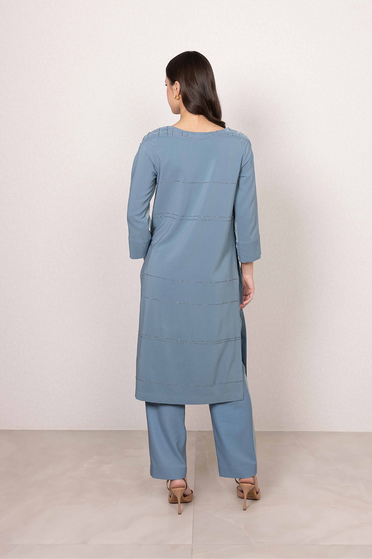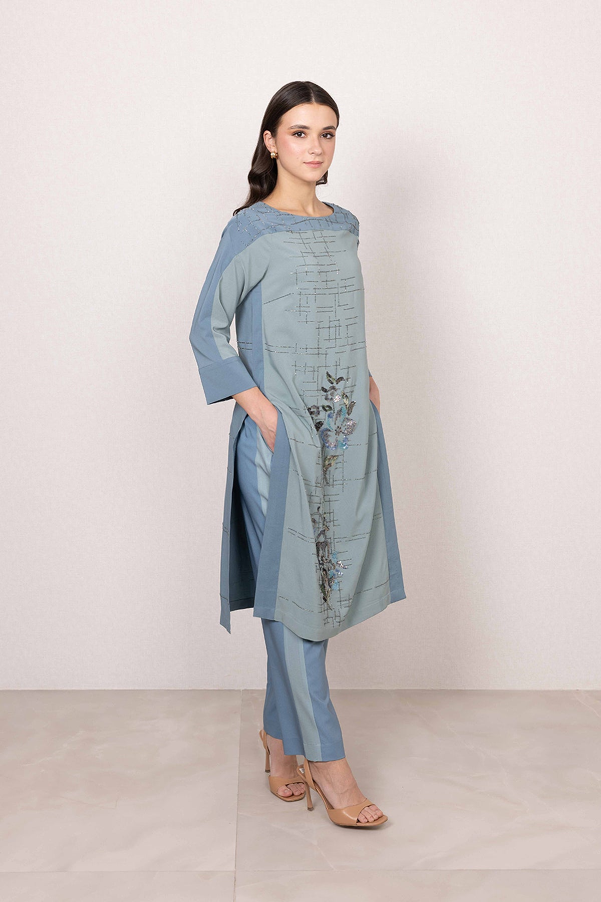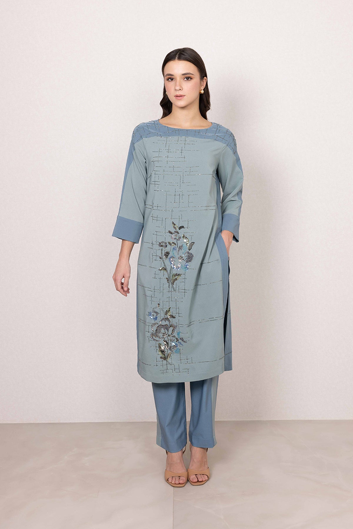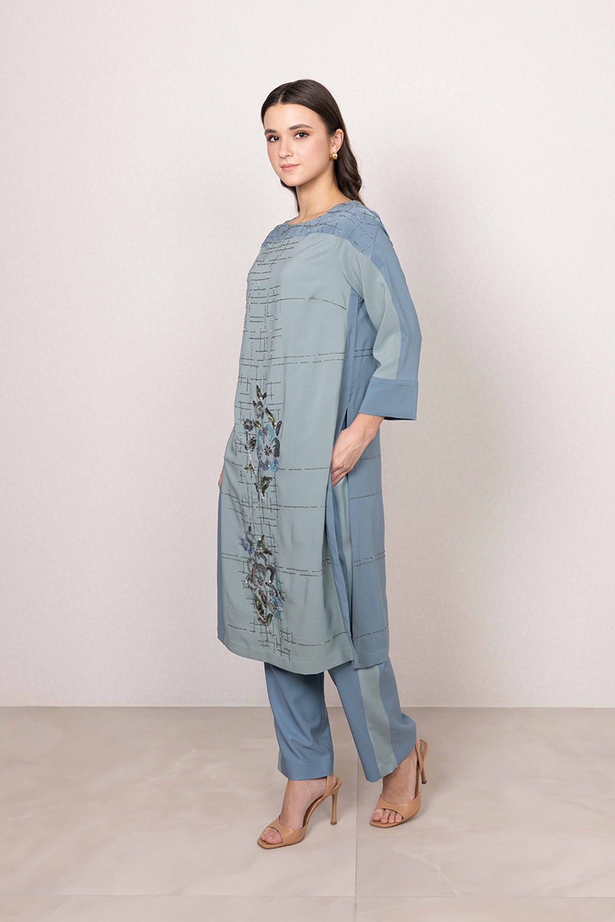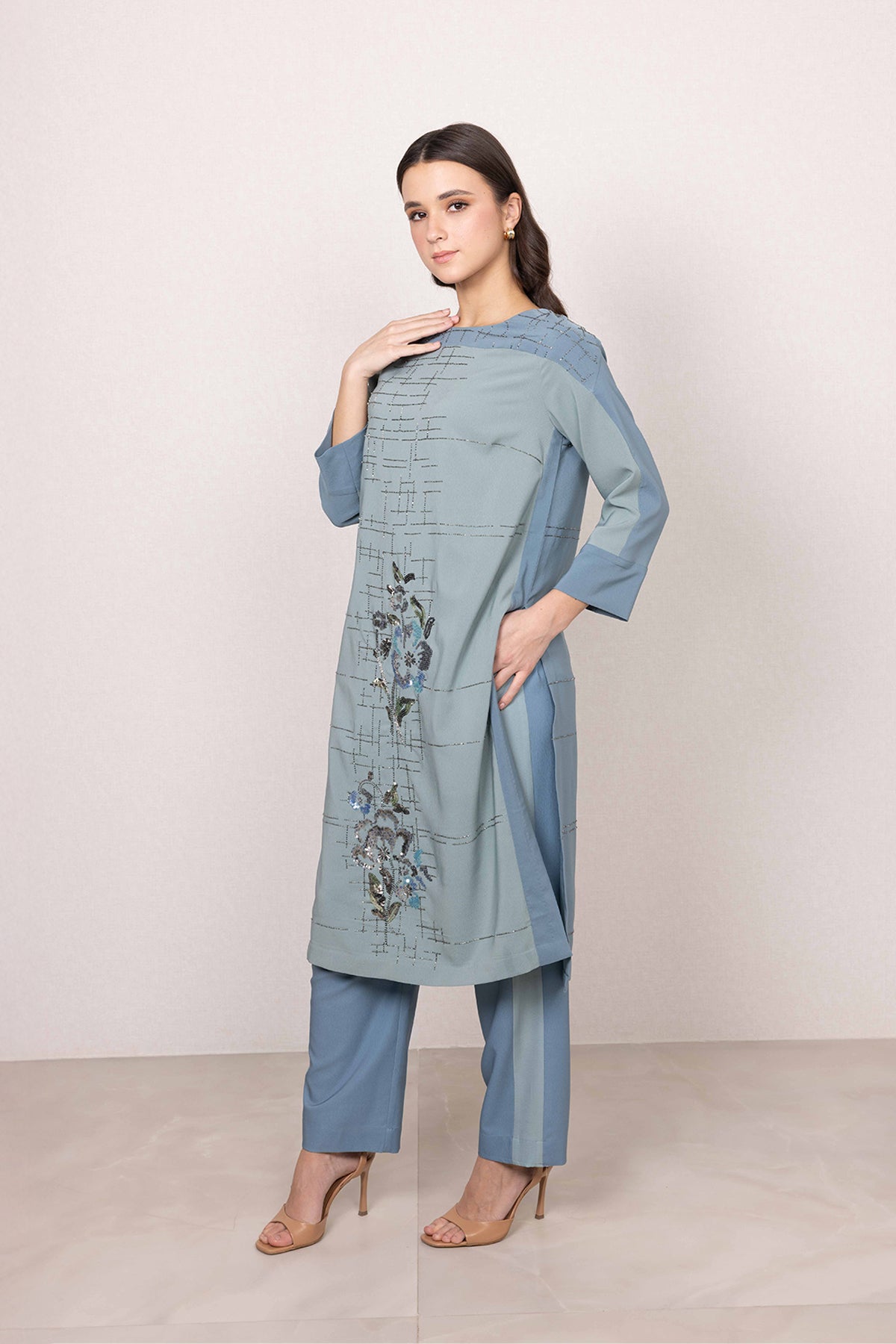 A calm palette sets the mood for the Idris Tunic Set, where sage green meets soft blue contrast panels. Made in poly crinkle, the tunic features a textured base highlighted with linear print detailing across the surface. Floral accents with subtle shimmer bring focus to the front, adding character without overpowering the look.