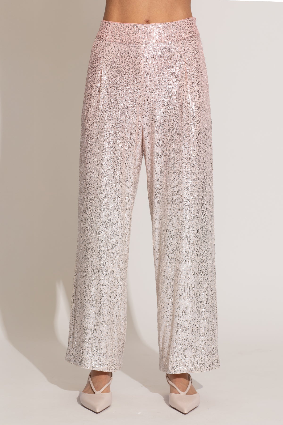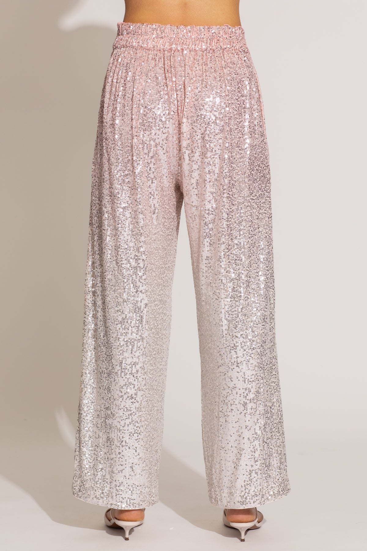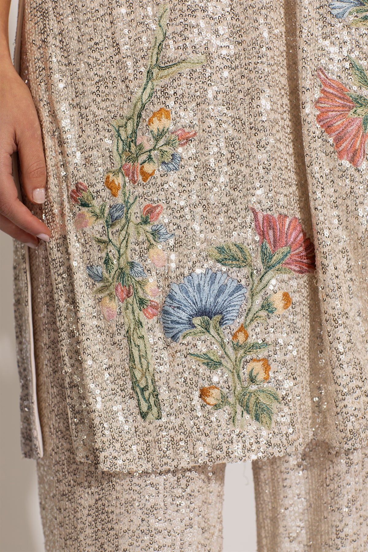 Add a touch of elegance to your wardrobe with Ranna Gill's Kate Sequin Tunic Set, a statement ensemble crafted in soft blush sequin fabric. The tunic has a V-neckline with delicate pleats at the front, adding fluidity to the silhouette. Embellished with intricate floral artwork, the embroidery showcases soft pastel blooms, creating a striking contrast against the shimmering base. Full-length sleeves with embroidered detailing elevate the style, while the straight-cut sequin pants complete the look with grace.