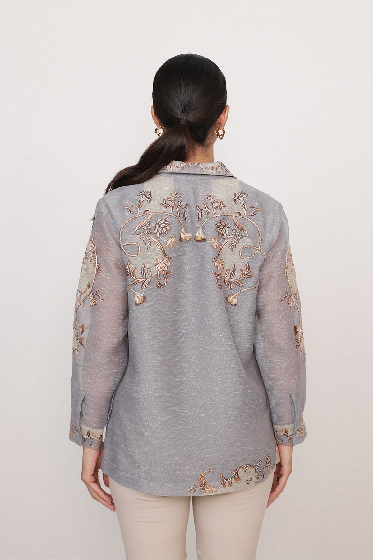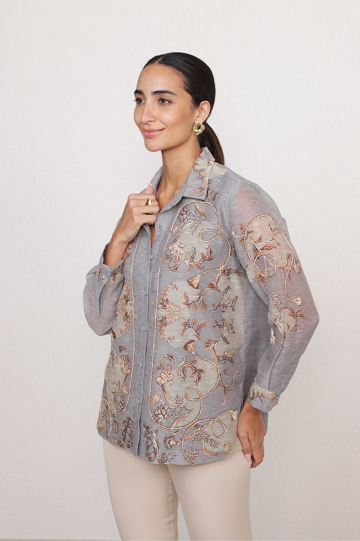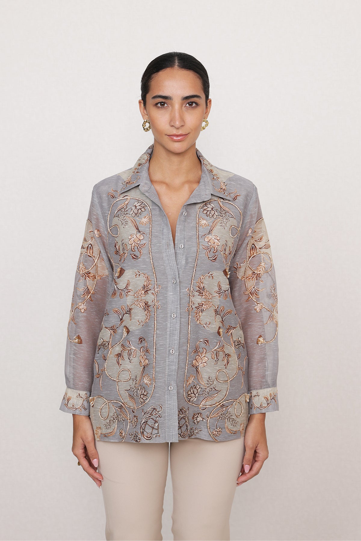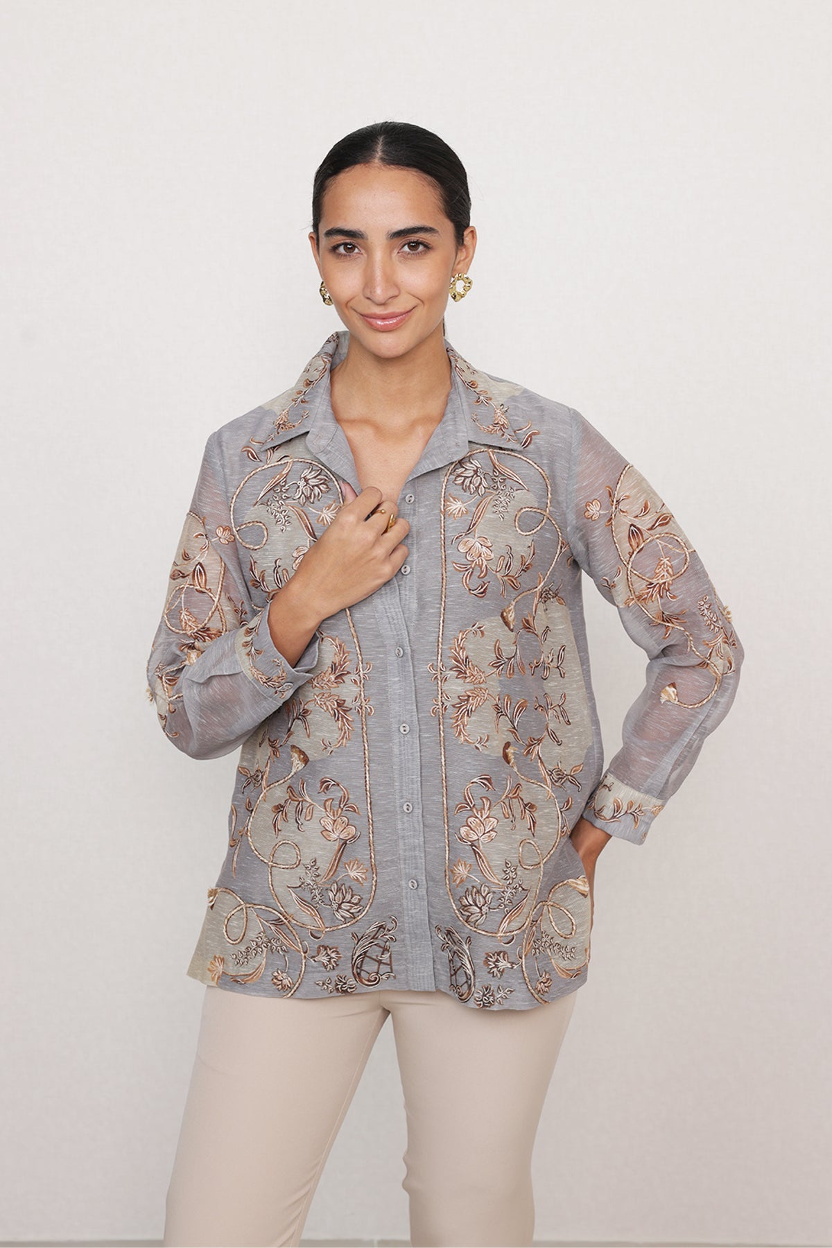 Grace finds a softer expression in Ranna Gill's Luna Shirt, where detail leads the conversation. Rendered in breathable Dhaka Linen, this warm grey shirt is adorned with intricate baroque-inspired embroidery in muted gold tones across the front and sleeves. A classic collar and button-through front give it structure, while the placement of print adds richness without excess.