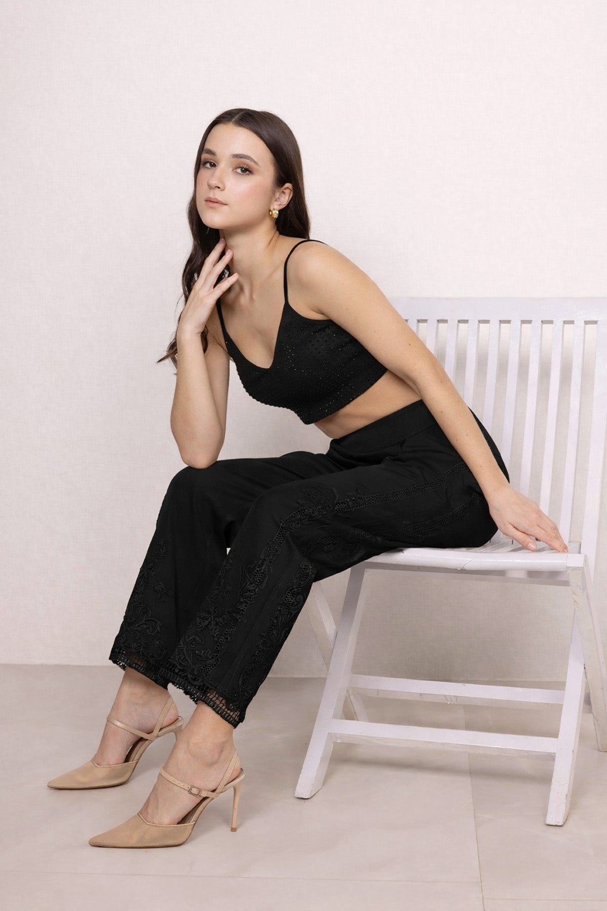 The Mae Black Lace Pants come in a black tone that feels soft, modern, and endlessly wearable. Finished with lace detailing along the hem, these pants bring texture without overpowering the look. The tailored fall flatters effortlessly while staying comfortable through the day.