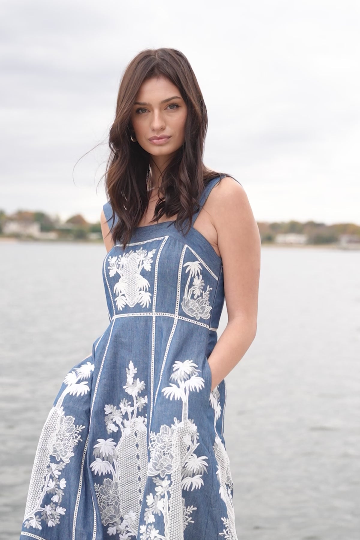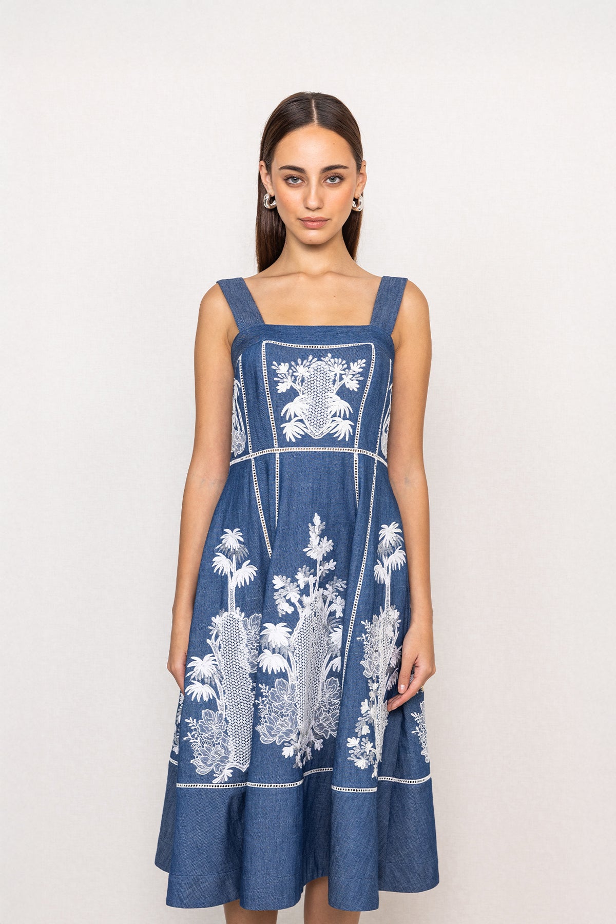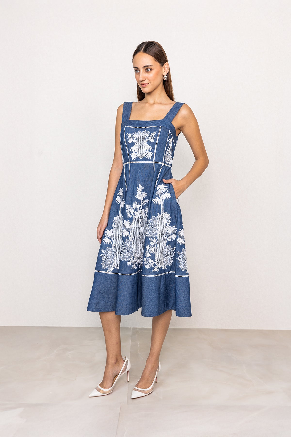 Clean lines meet detailed artwork in the Odette Panel Midi Dress, crafted in blue denim with a structured yet wearable feel. Designed sleeveless with a square neckline, it highlights the shoulders while offering a balanced, tailored fit through the bodice. The dress features panelled construction with soft pleats that add shape and definition to the midi silhouette. Intricate white artwork embroidery is placed across the bodice and skirt panels, creating contrast and visual depth against the denim base. A flared hem completes the look, making it comfortable for all-day wear while retaining a sharp, put-together finish.