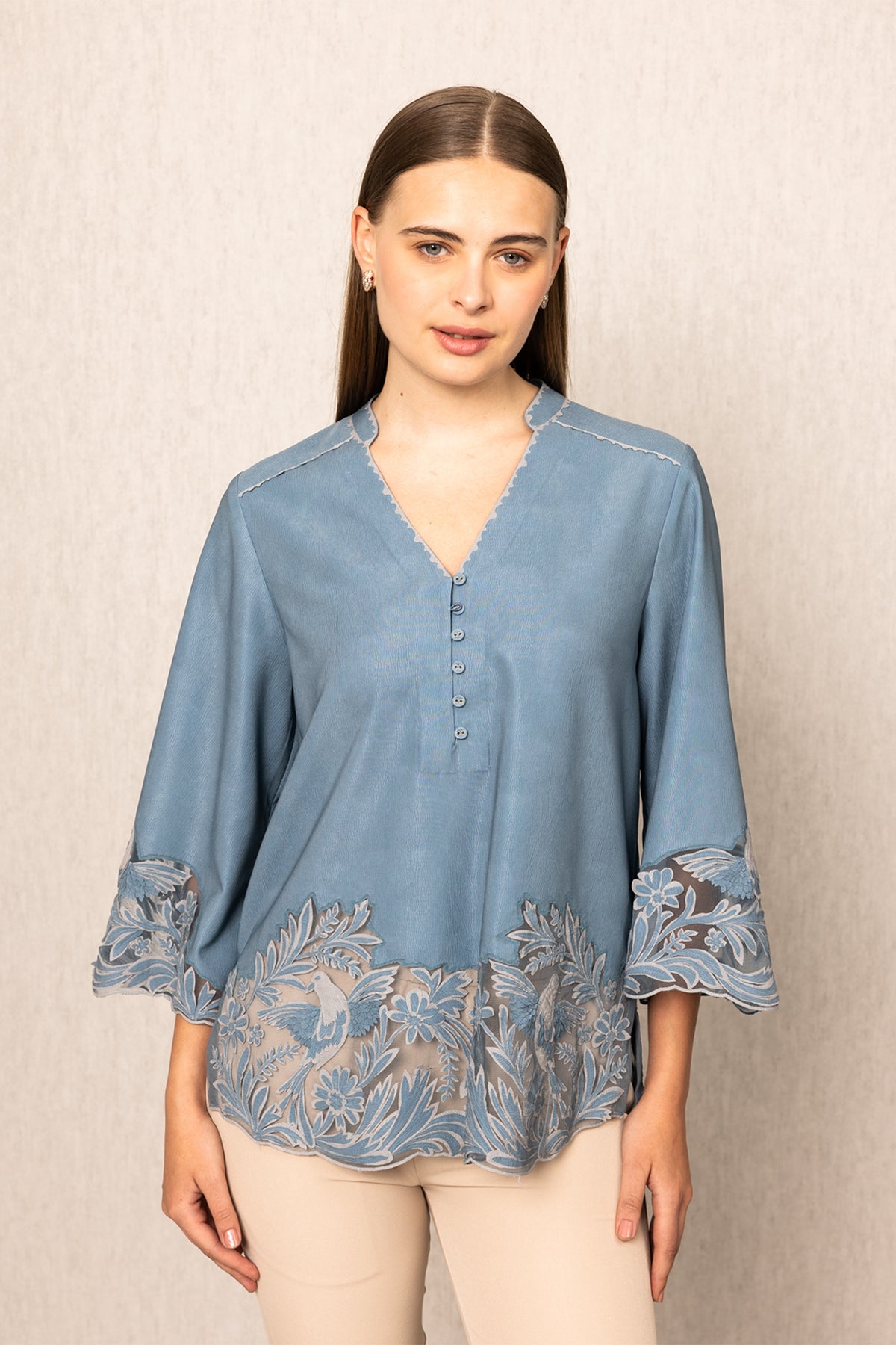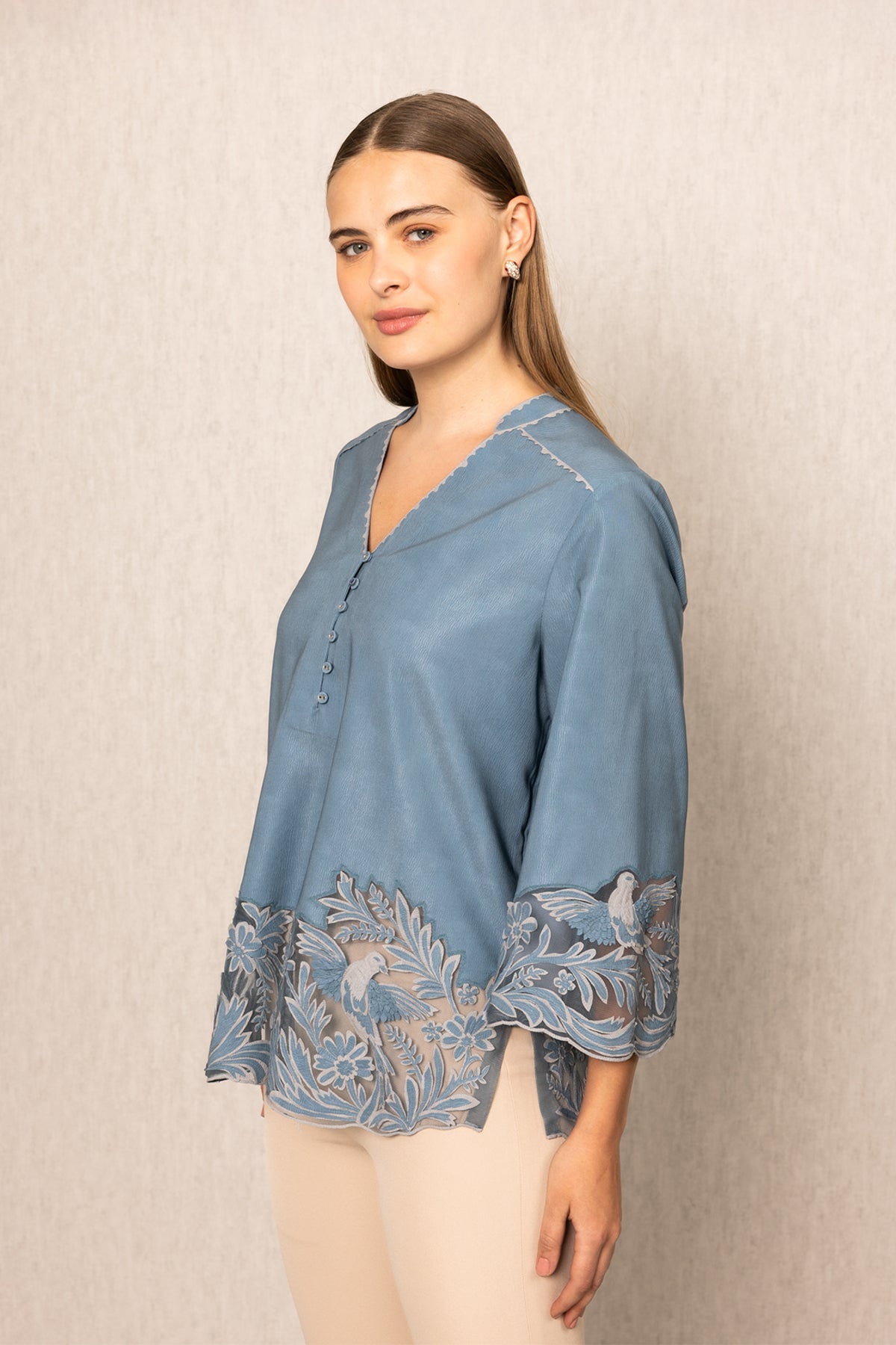 Ranna Gill's Roselake Blouse in China Crinkle feels like a quiet escape into the countryside where crisp air meets faded blue skies. Designed in a Teal color, this blouse features tonal embroidery with birds, leaves, and florals along the hem and sleeves, brought to life through sheer mesh panels. The silhouette is gently flared with soft gathers that skim the waist. Ideal for days when you’re in the mood to slow down: art walks, weekend cafés, or even a mountain stay. Pair it with neutral trousers or soft denims, and let the details do all the talking.