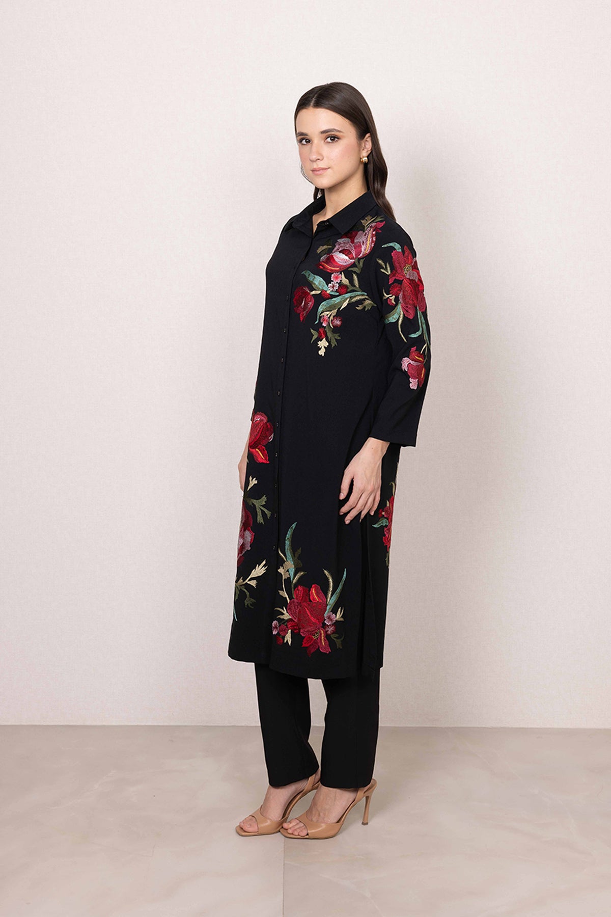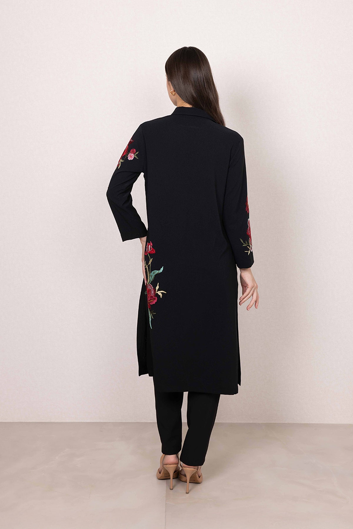 A striking black base brought to life with oversized floral artwork, Ranna Gill's Solana Black Tunic is made in poly crinkle for a lightly textured feel and a clean fall on the body. The tunic features a classic shirt collar with a concealed button-down front, balanced by three-quarter sleeves that sit neatly at the arm. Multicolour rose motifs are placed across the front and sleeves, creating a statement look without overwhelming the silhouette.