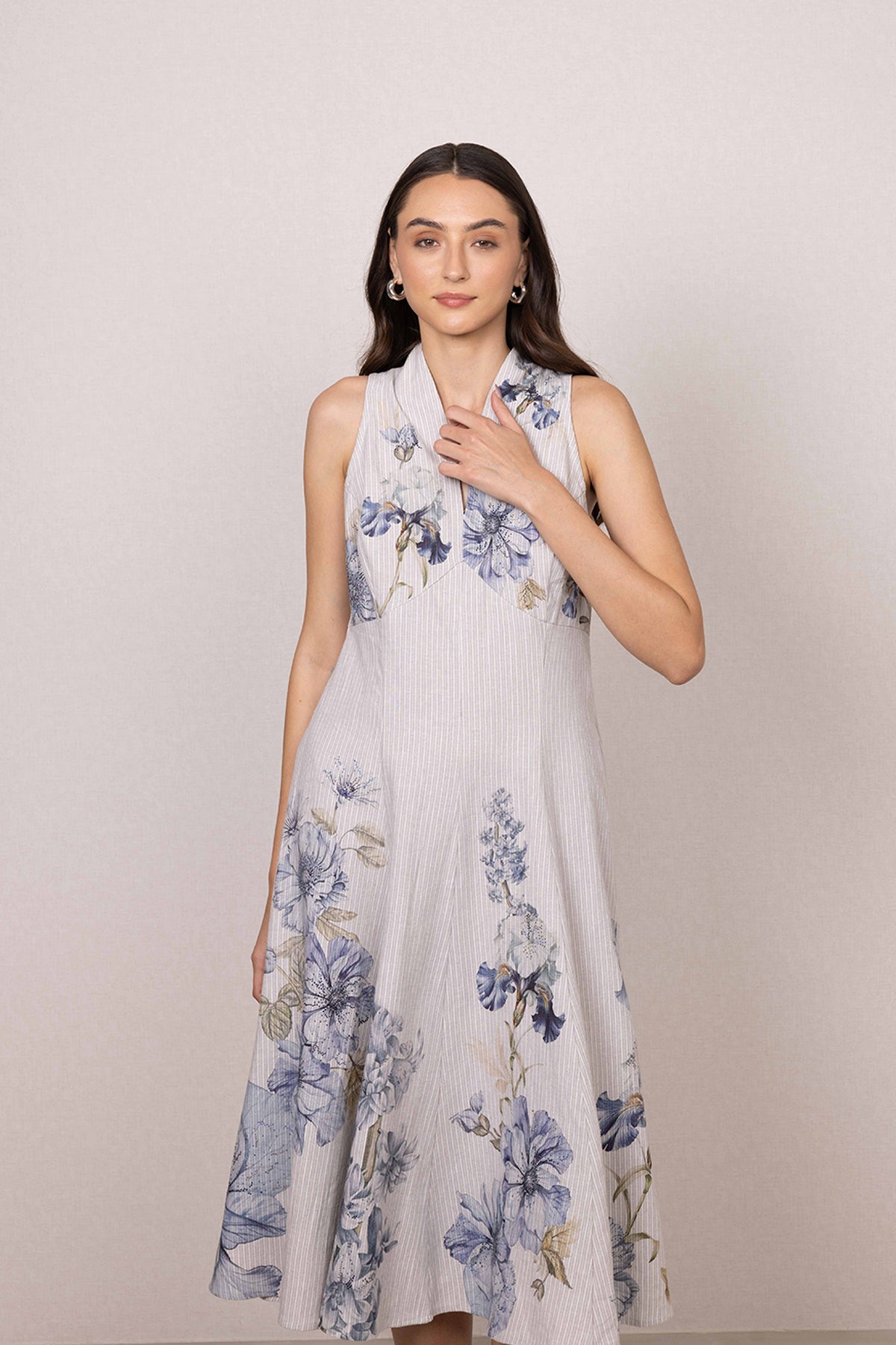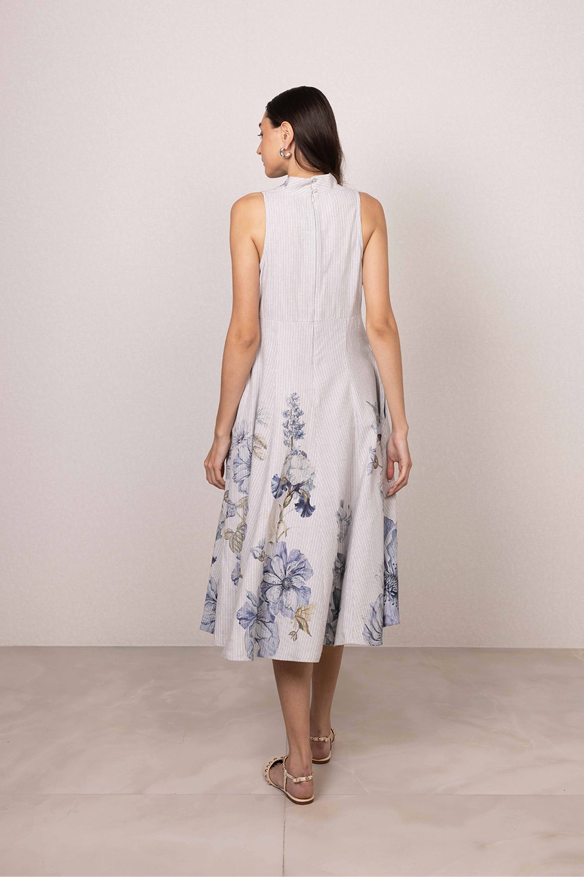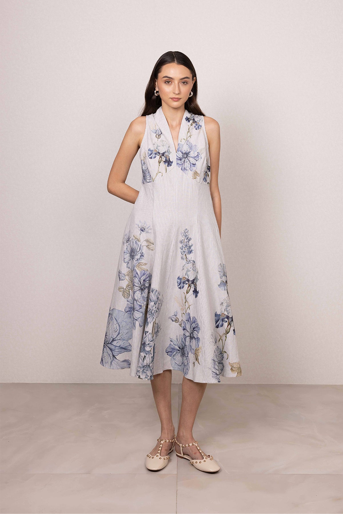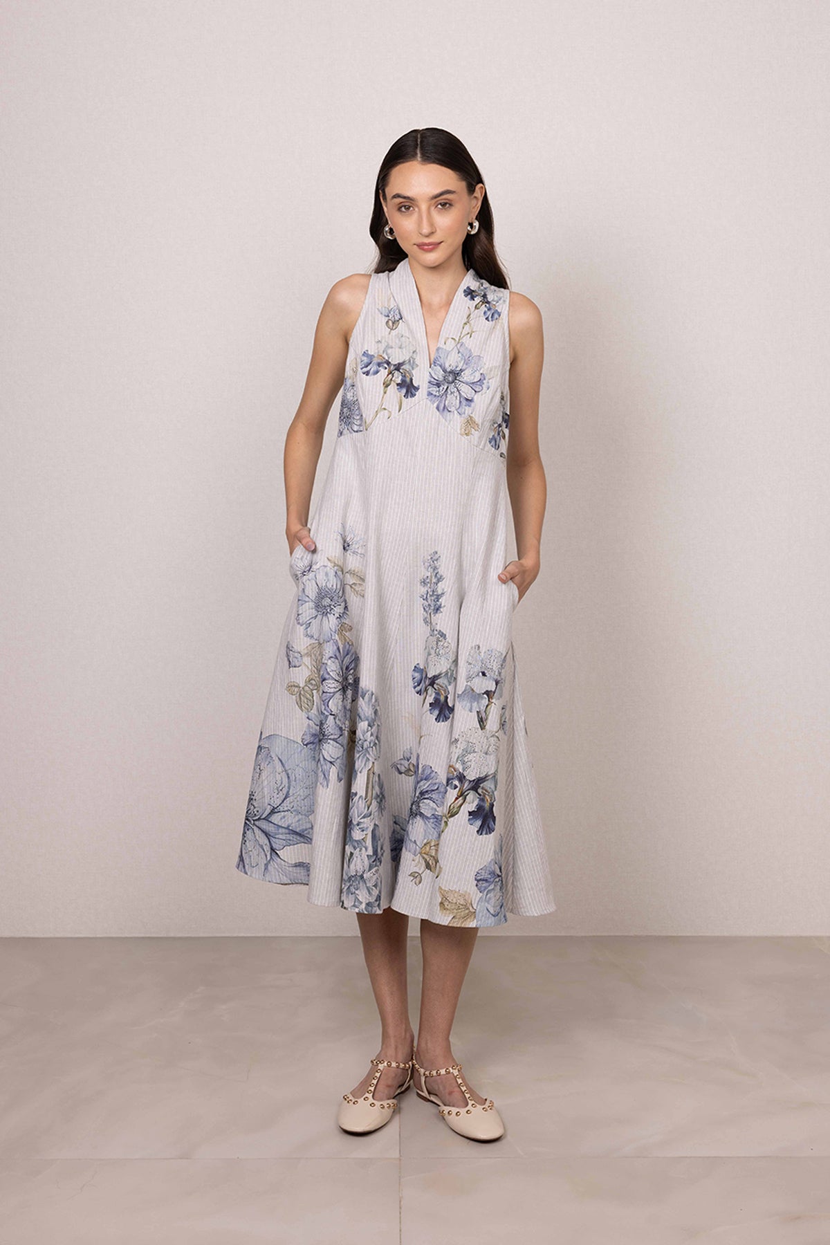 A soft play of florals comes alive on the Verona Midi Dress, setting a calm yet elevated mood. Rendered in an ivory base with blue floral print, the dress features a halter neckline that draws attention upward.